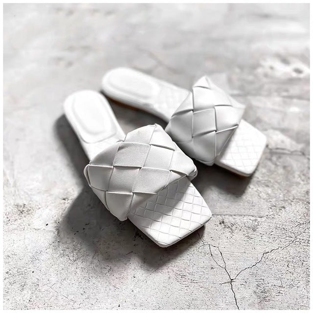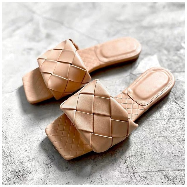 <transcy>Sandalia plana con estampado tejido</transcy>