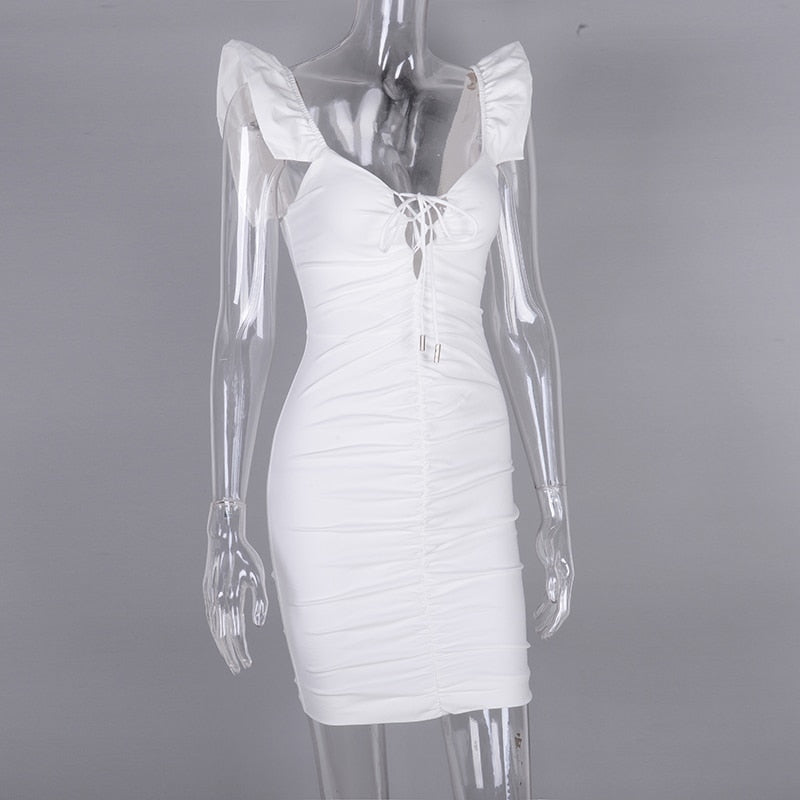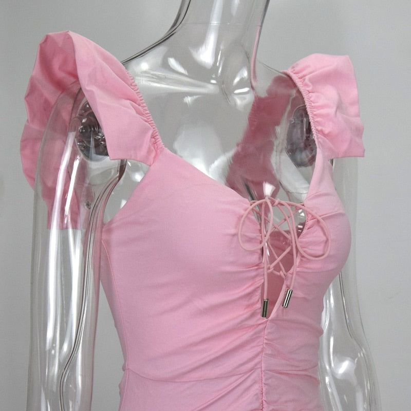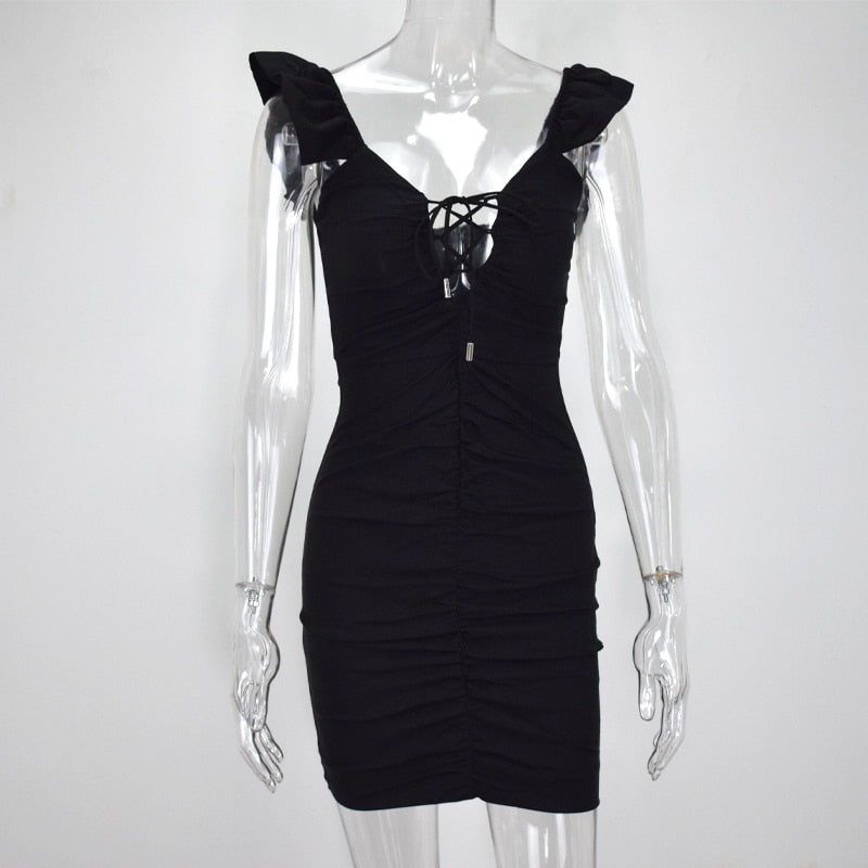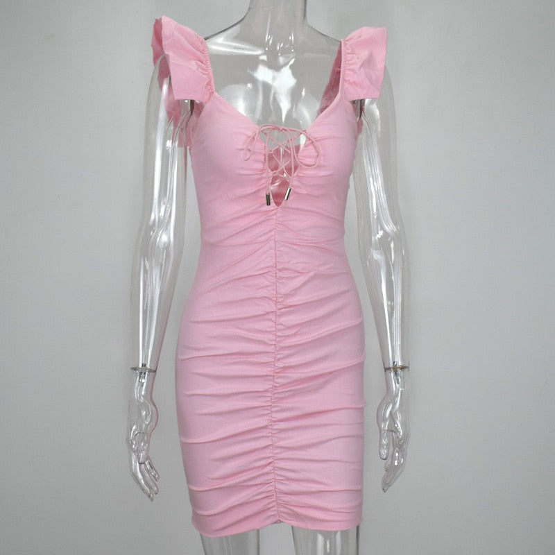 <transcy>Mini vestido de mujer con cuello en V profundo con cordones y manga de mariposa</transcy>