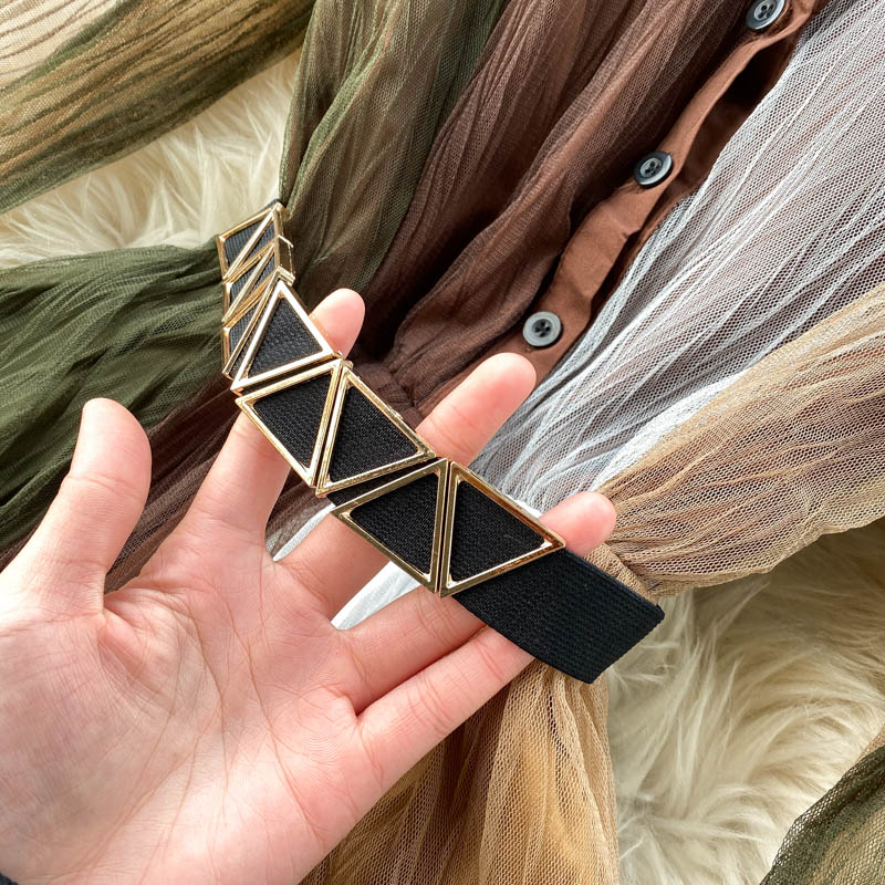 Vestido largo multicolor con mangas farol y cuello vuelto hecho de material de malla acrílica