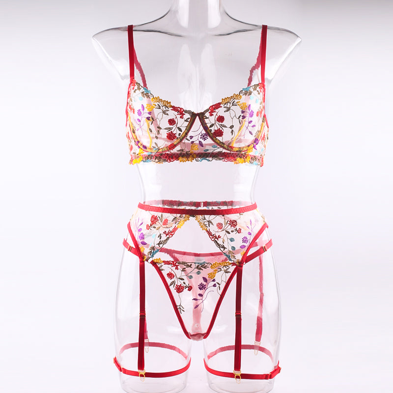 What's better than a night in with your lover? A night in with your lover wearing this sexy, seductive lingerie set. This lovely lace and floral embroidery trimmed set is perfect for a romantic evening in.
