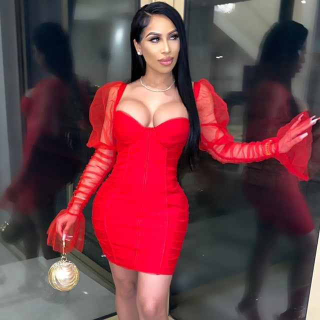 <transcy>Mini vestido ajustado elegante de malla sólida con manga abullonada para mujer</transcy>