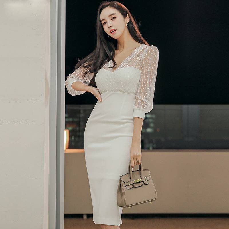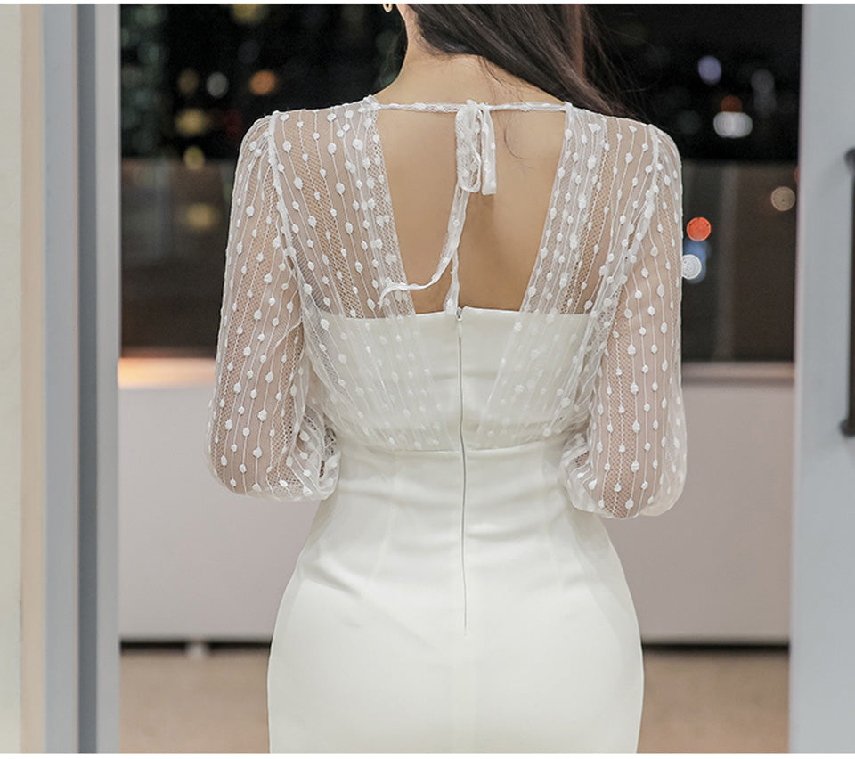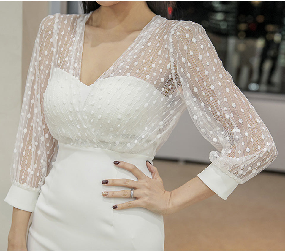 For a look that's as stylish as it is sexy, this v-neck midi dress is a must-have. It can be worn from day to night for a bold but elegant look. The half sleeve is see-through with a polka dot pattern.