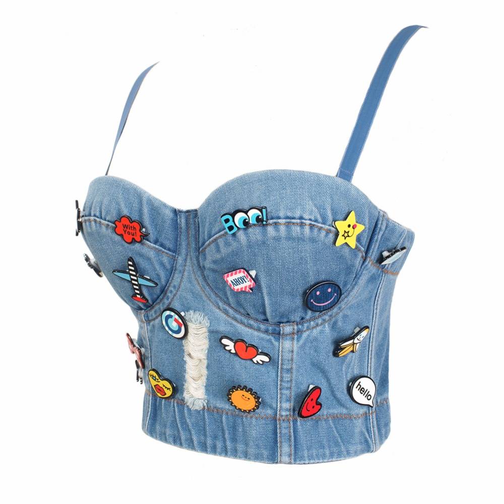 Top corto sin mangas liso de mezclilla acrílica, poliéster y licra, con pasadores, apliques, decoración