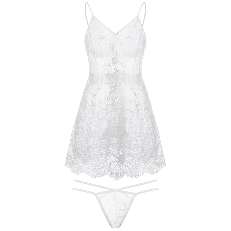 Conjunto de camisón y braguita de spandex de encaje transparente con bordado floral y tirantes finos