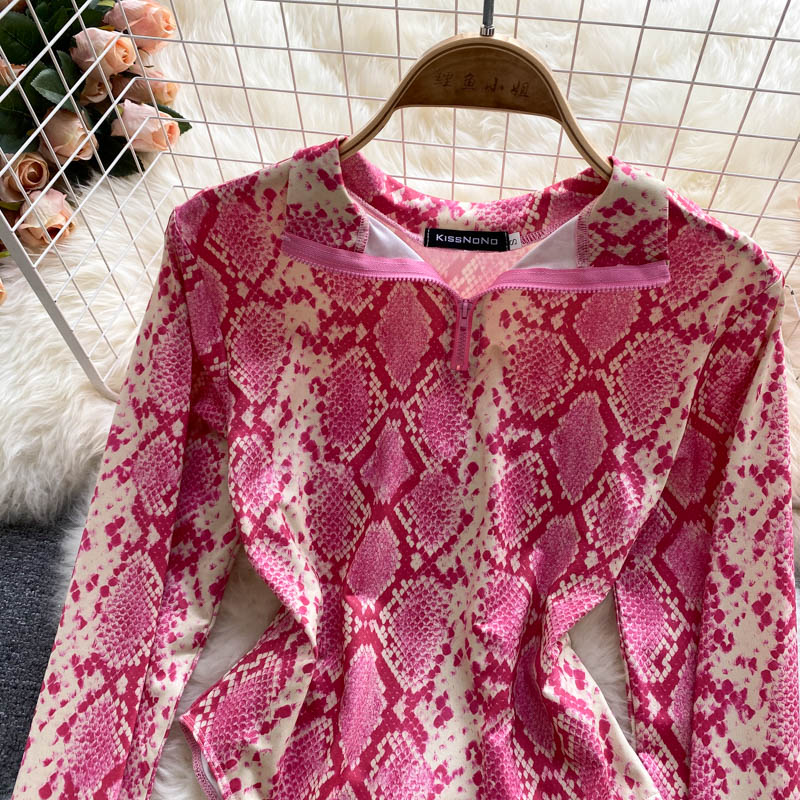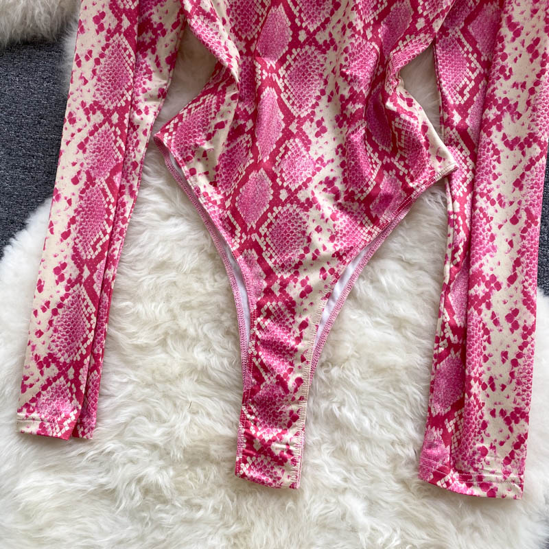 A bodysuit is the perfect layering piece for your wardrobe! This pink snakeskin print bodysuit has long sleeves and has a cheeky fit. You'll feel confident and sexy in this one!