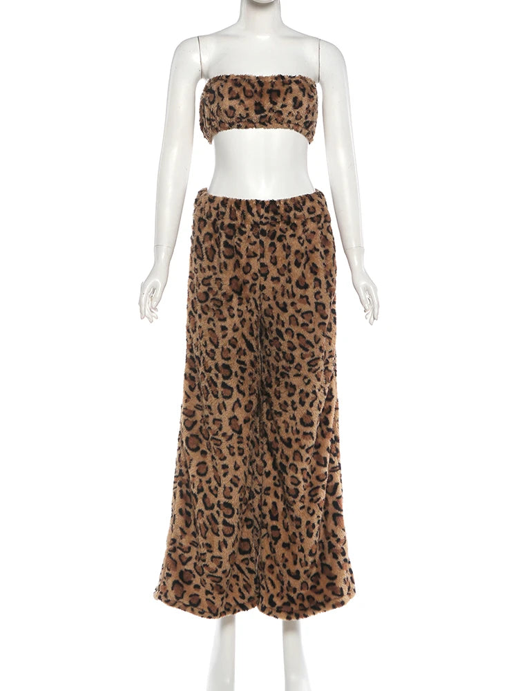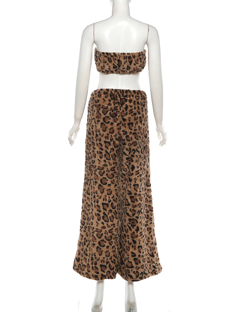 Furry Leopard Print Pants Set