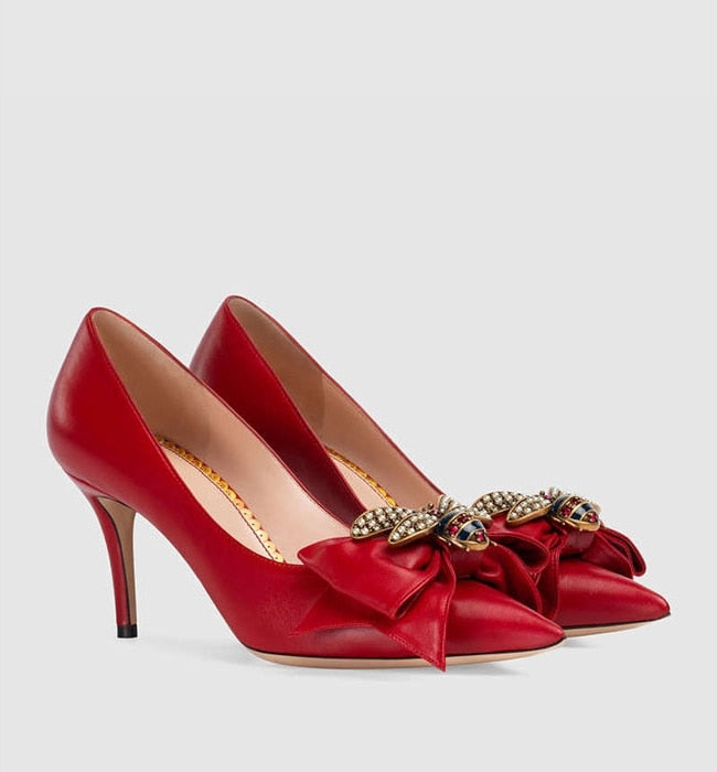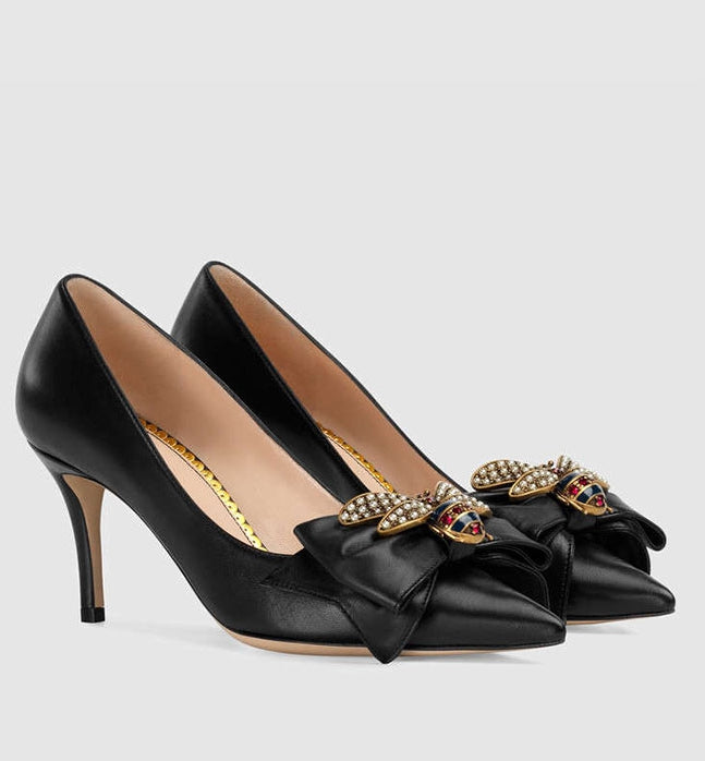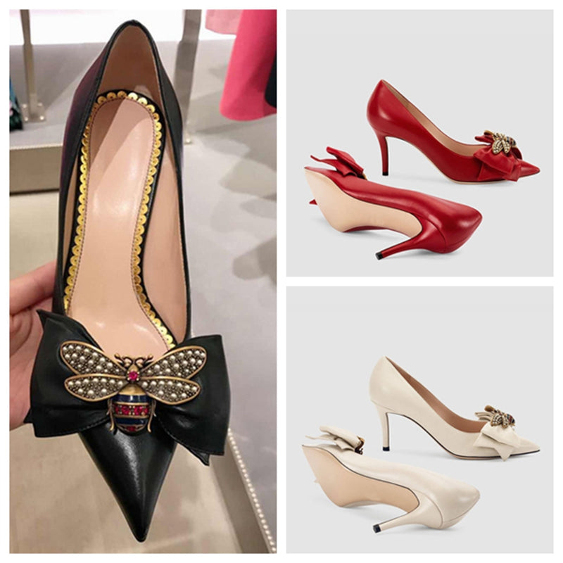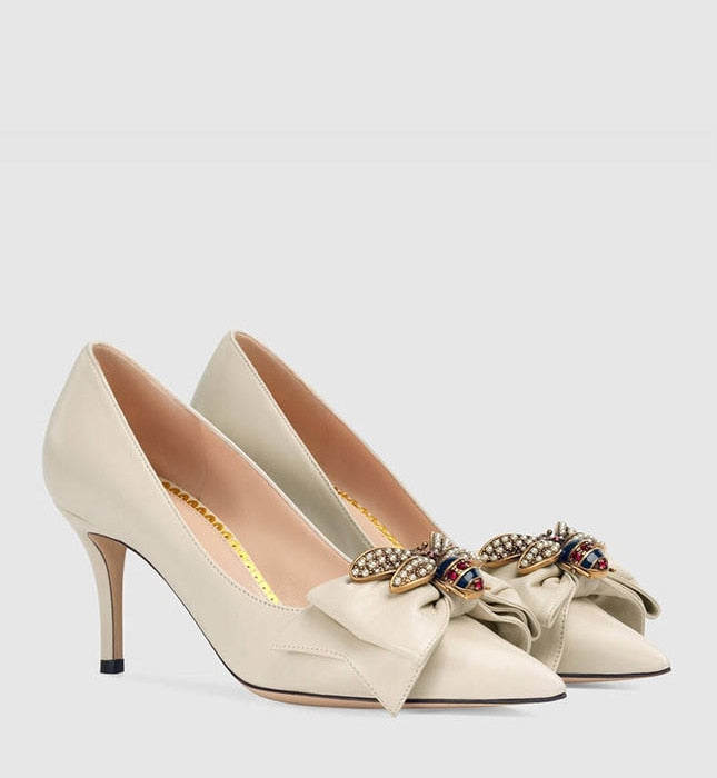 Cuero genuino Hermosa abeja Decoración Punta puntiaguda Tacones finos Stiletto de mujer