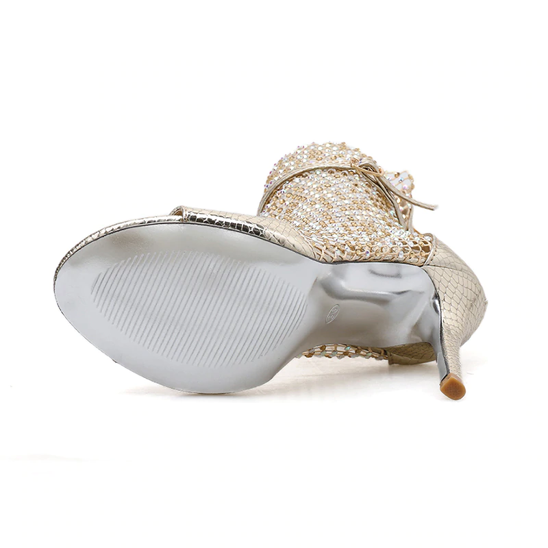 Estilete de malla con punta abierta y estampado de piel de serpiente con decoración de diamantes de imitación