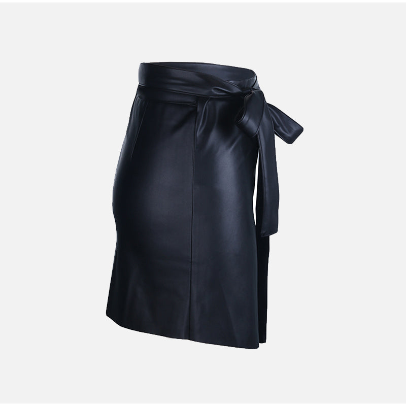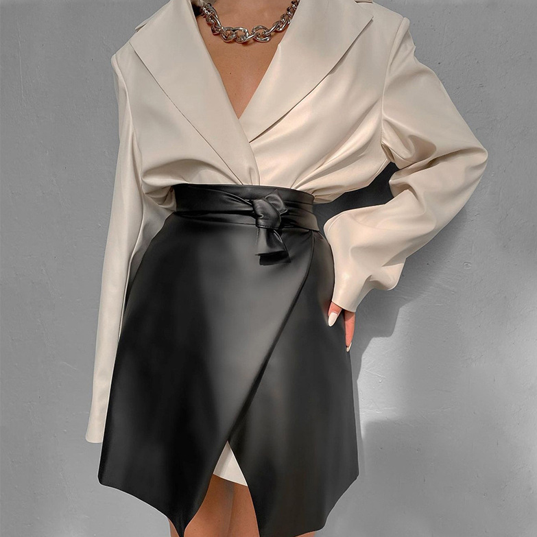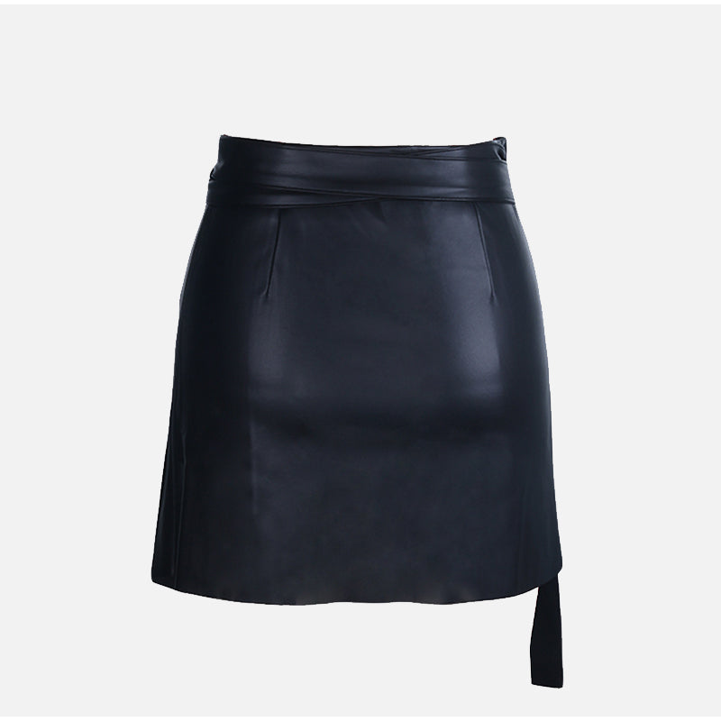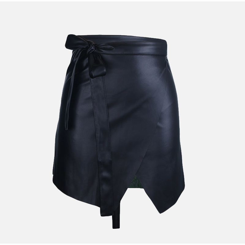 Asymmetrical Mini Skirt Made From PU Leather with High Waist and Sashes