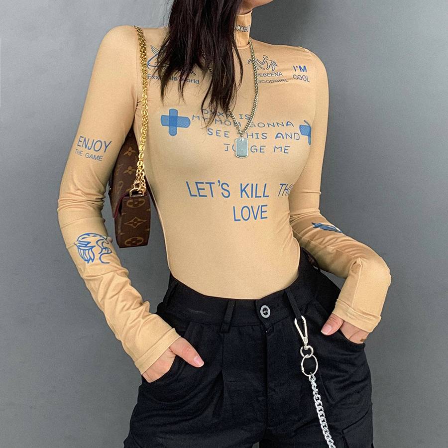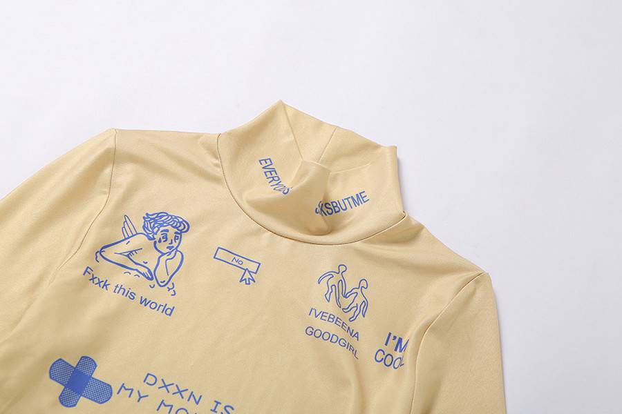 This women's bodysuit is made from soft, comfortable, and durable polyester, so it's ideal for everyday wear. It has a stylish turtleneck, so you can look sharp when needed. The letter print on this women's bodysuit is subtle, so it won't distract from your outfit, but it still looks stylish. It's a great addition to any outfit for a good price.