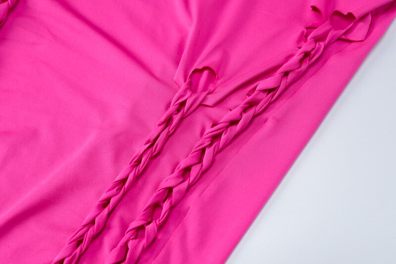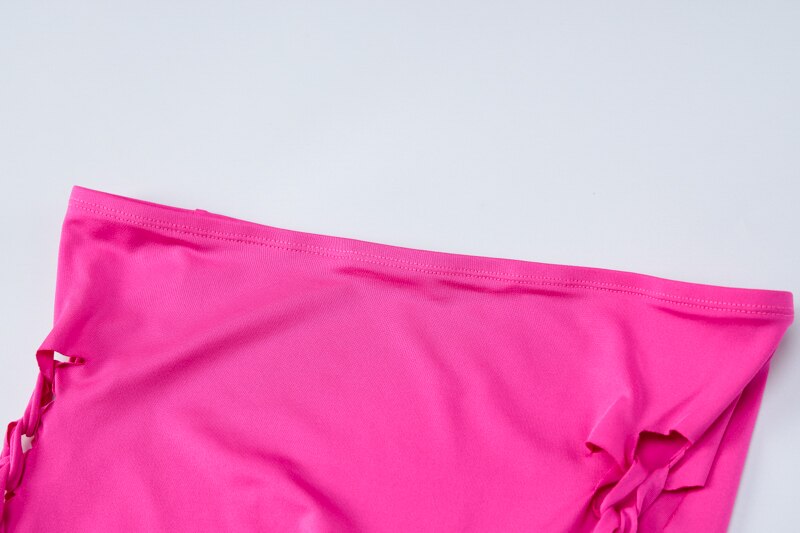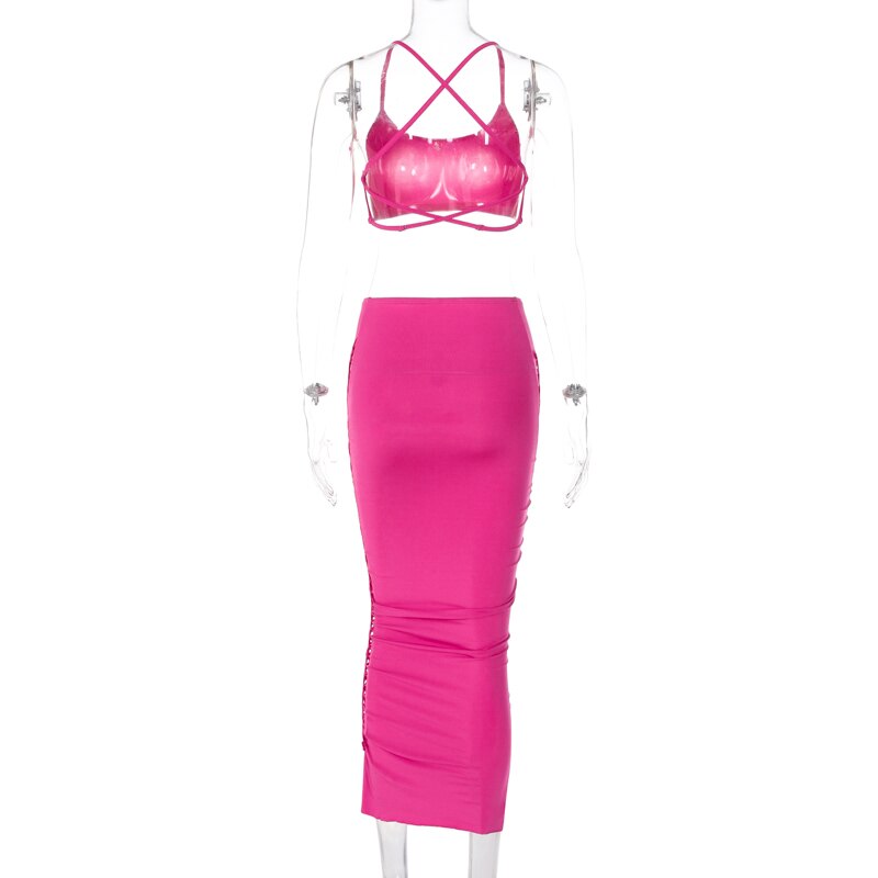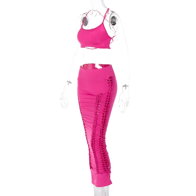 The crop tank top and midi skirt combo create a chic and trendy look that can be dressed up or down. The hollow-out lace decoration adds a touch of feminine elegance to the outfit. The set is available in three colors.
