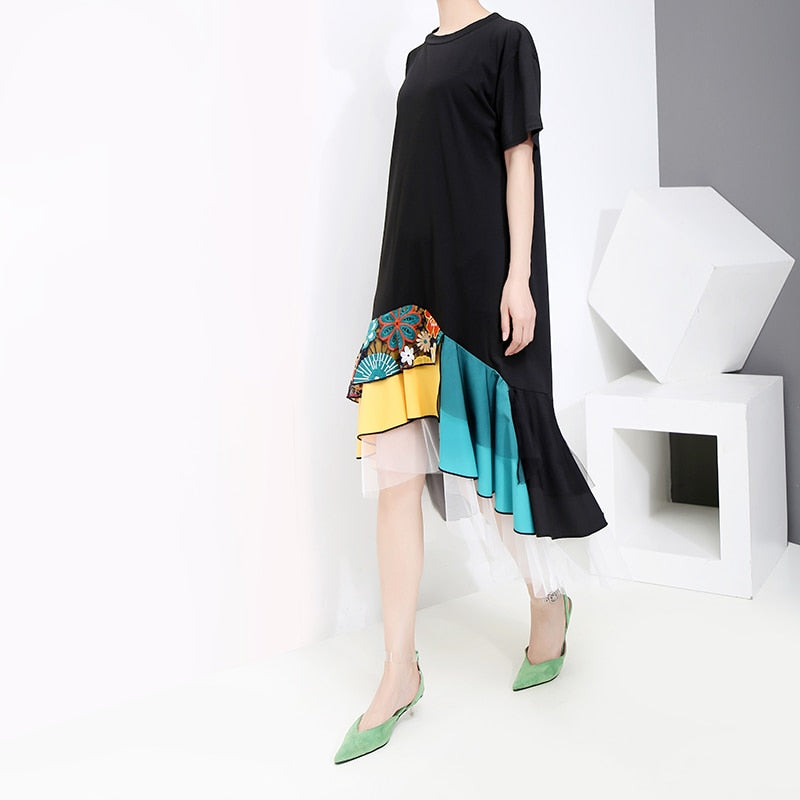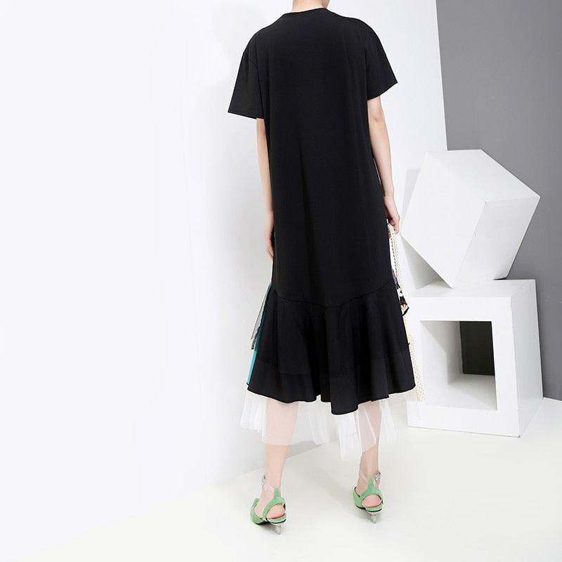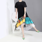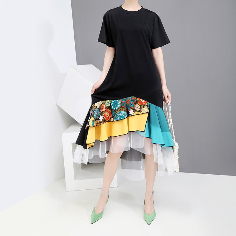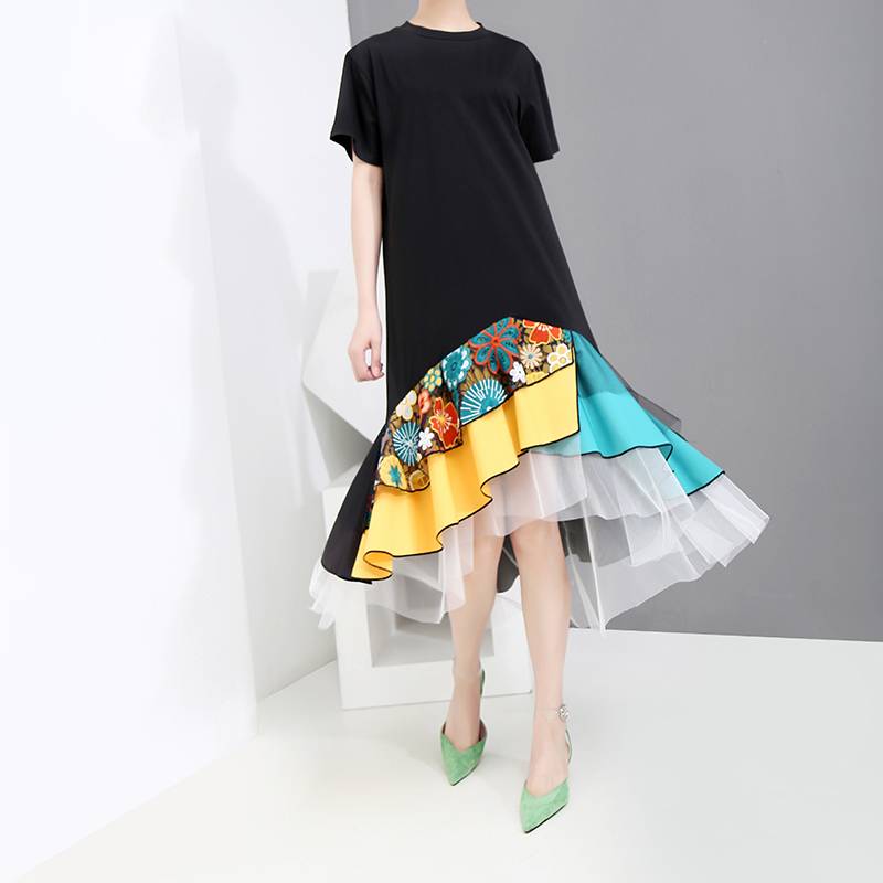 Estilo camiseta-vestido de rayón de algodón con manga corta y cuello redondo