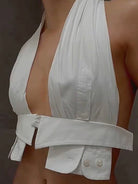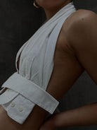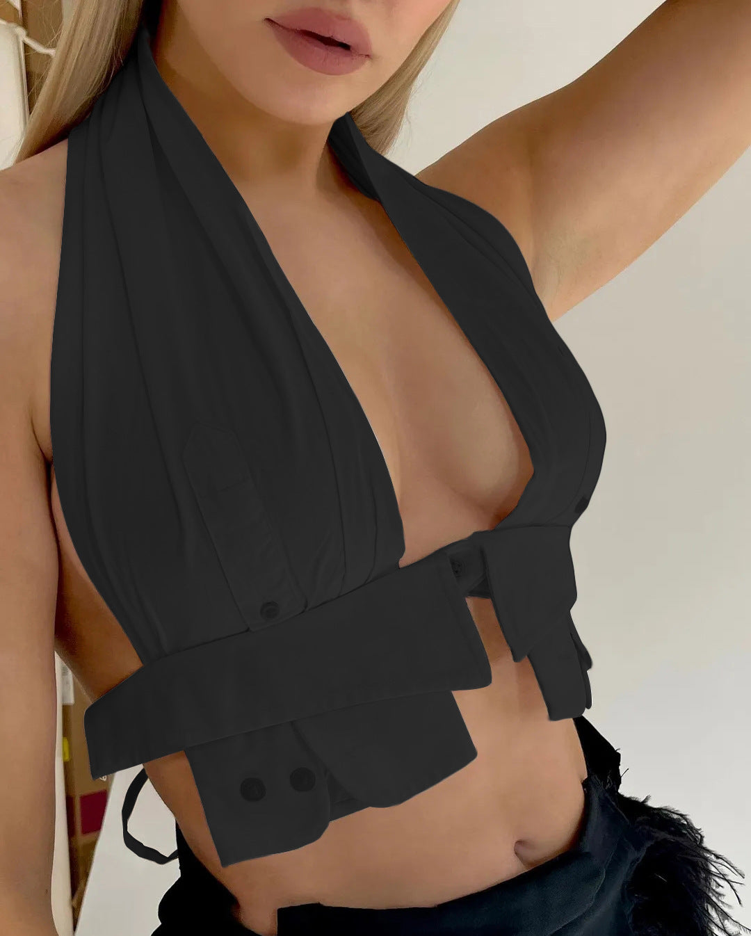 She'll love the look and feel of this casual crop top that is designed to flatter a woman's curves. A flattering sleeveless design that is made from soft cotton fabric is a practical and comfortable option. The halter neckline and stylish backless design ensure she looks her best in any situation. The subtle buttons add a touch of refined style to the simple and effortless silhouette. A simple and effortless way to enjoy the summer in fashion-forward style.