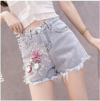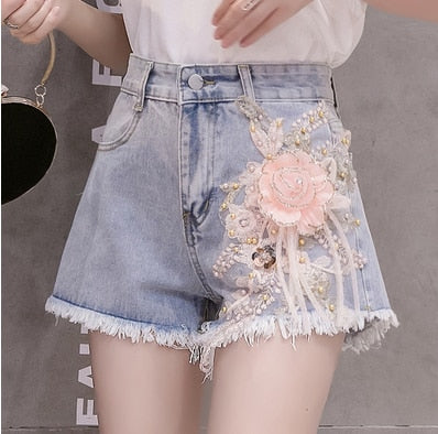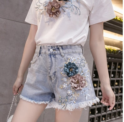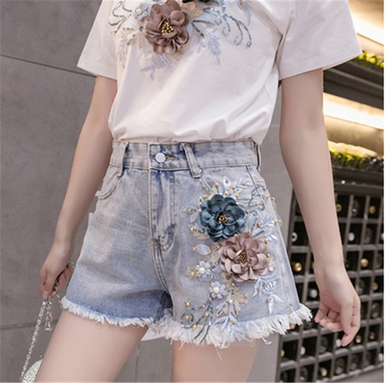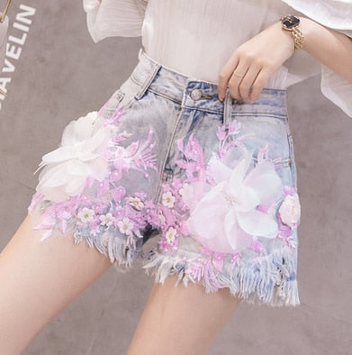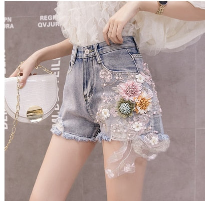 Shorts de mezclilla de cintura alta con apliques florales y material de algodón