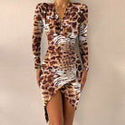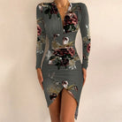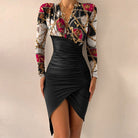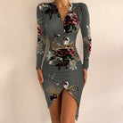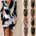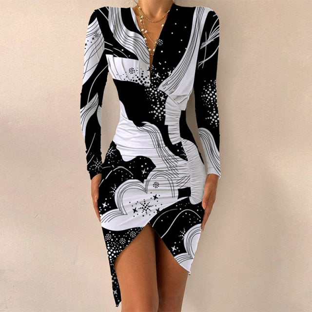 A classy yet comfortable long-sleeved mini dress, this versatile piece is sure to become an essential part of any wardrobe. This garment has a stylish fitted silhouette with a flattering v-neck. Available in beautifully printed designs that are sure to make an impression.