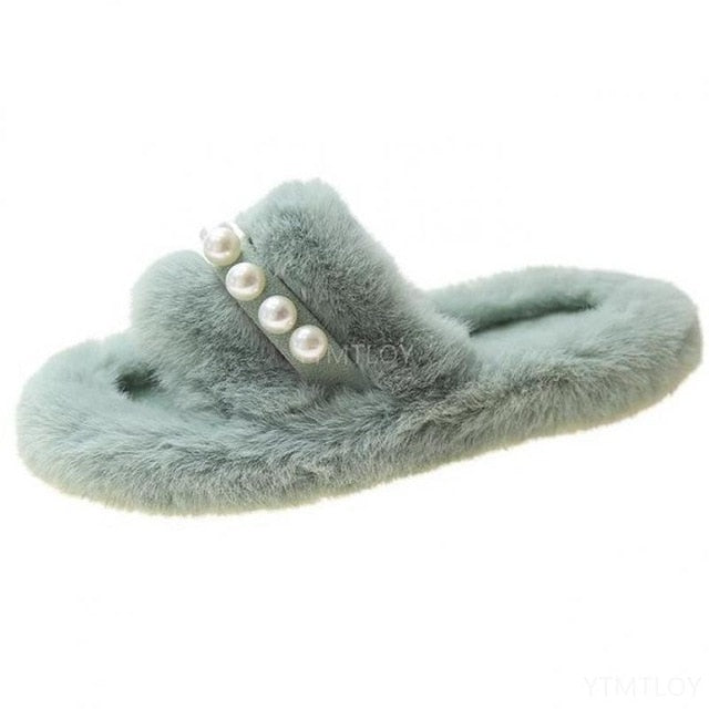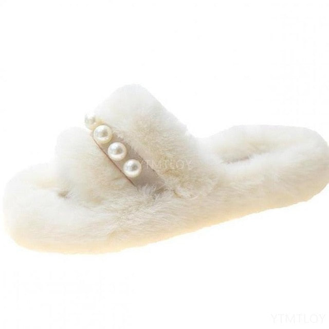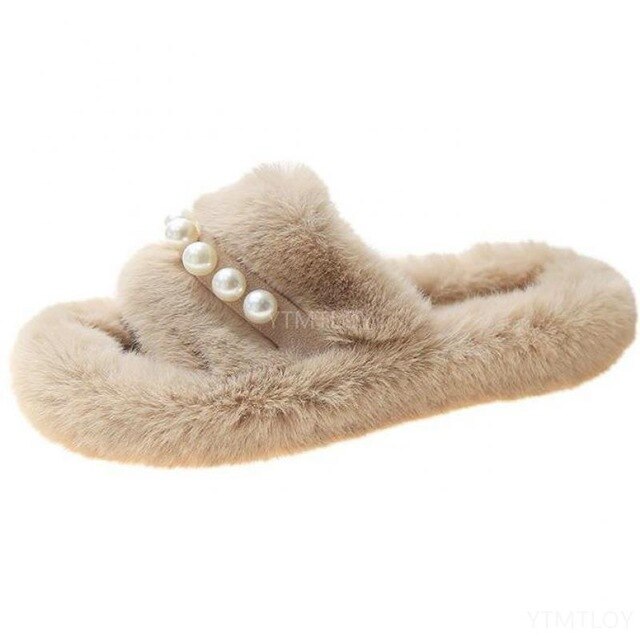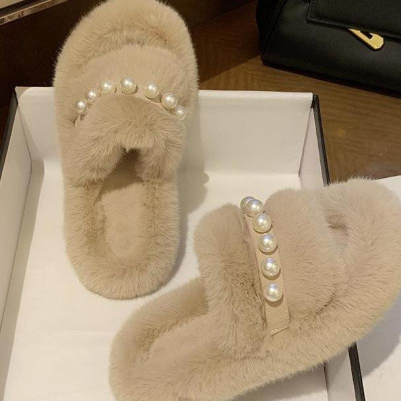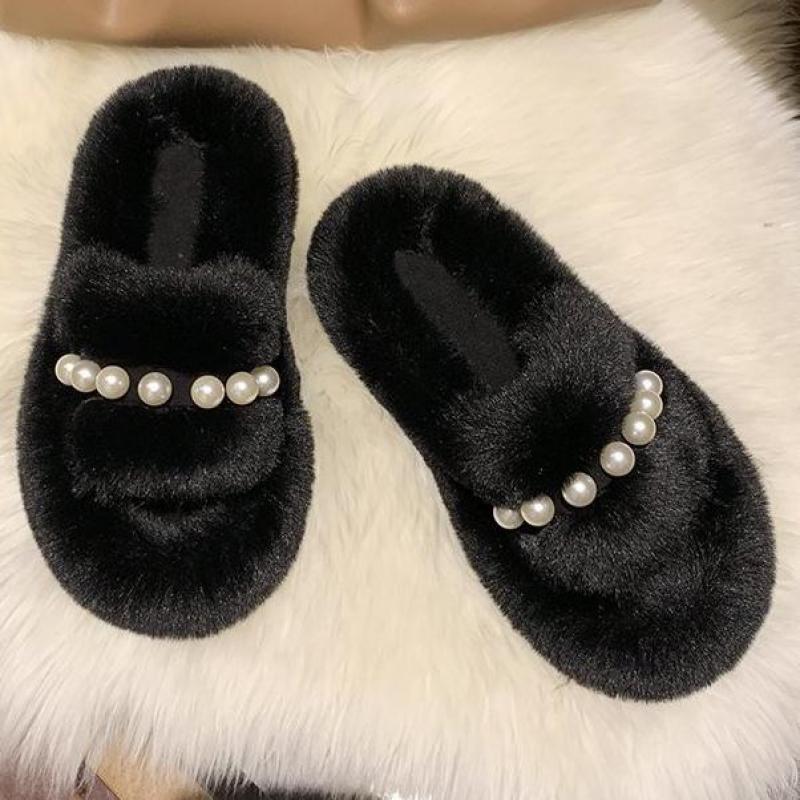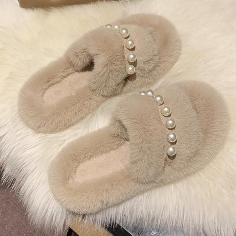 Sandalia tipo pantufla de piel sólida con decoración de perlas, vellón, felpa, goma y material de PU