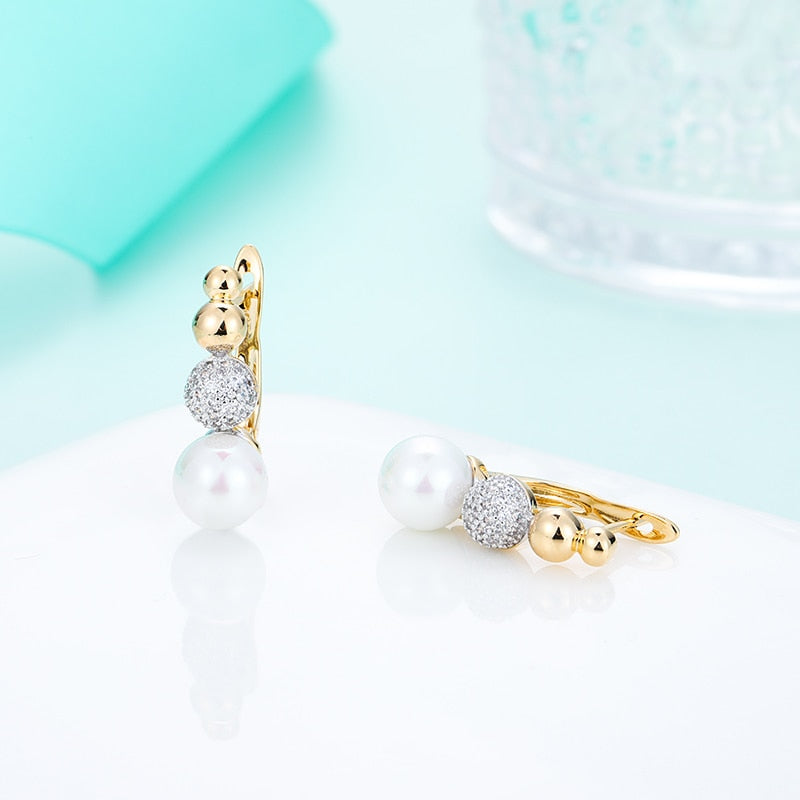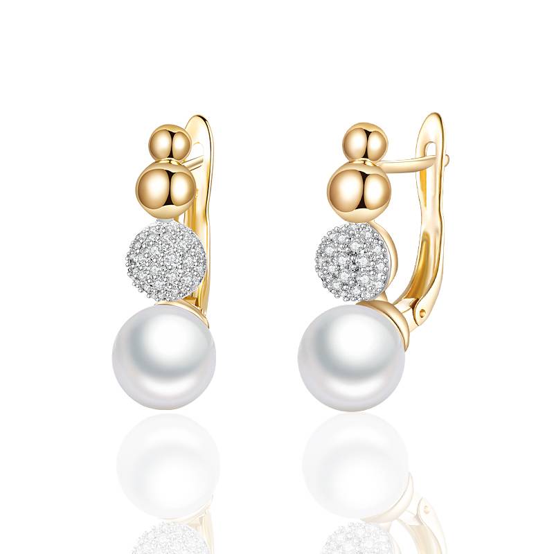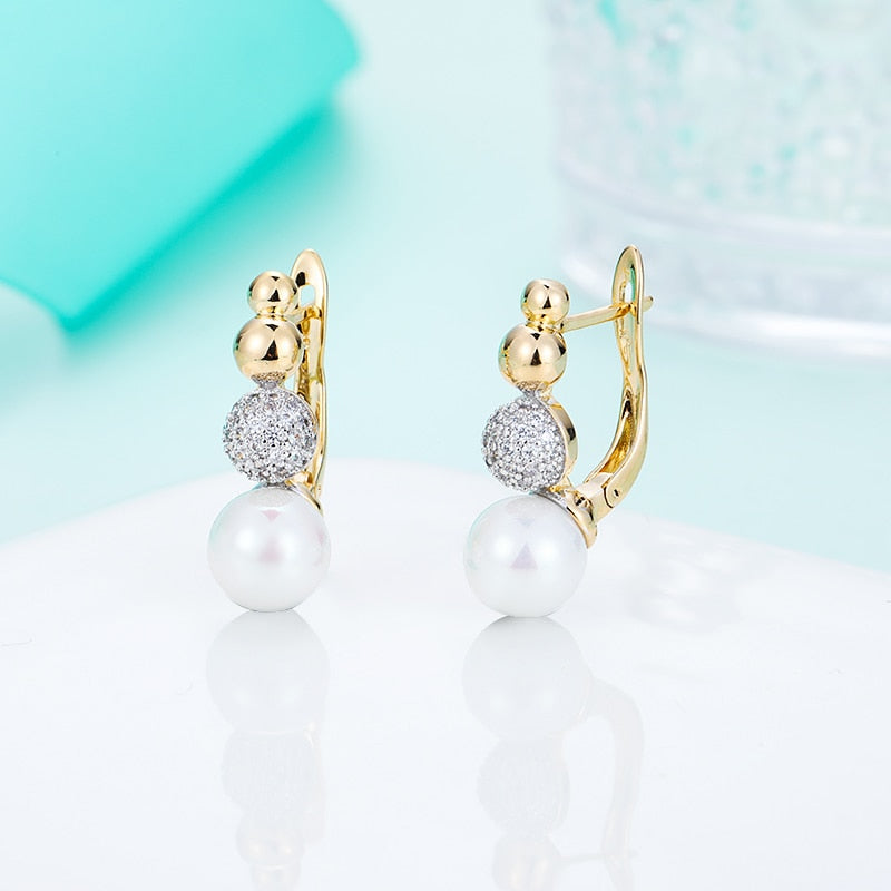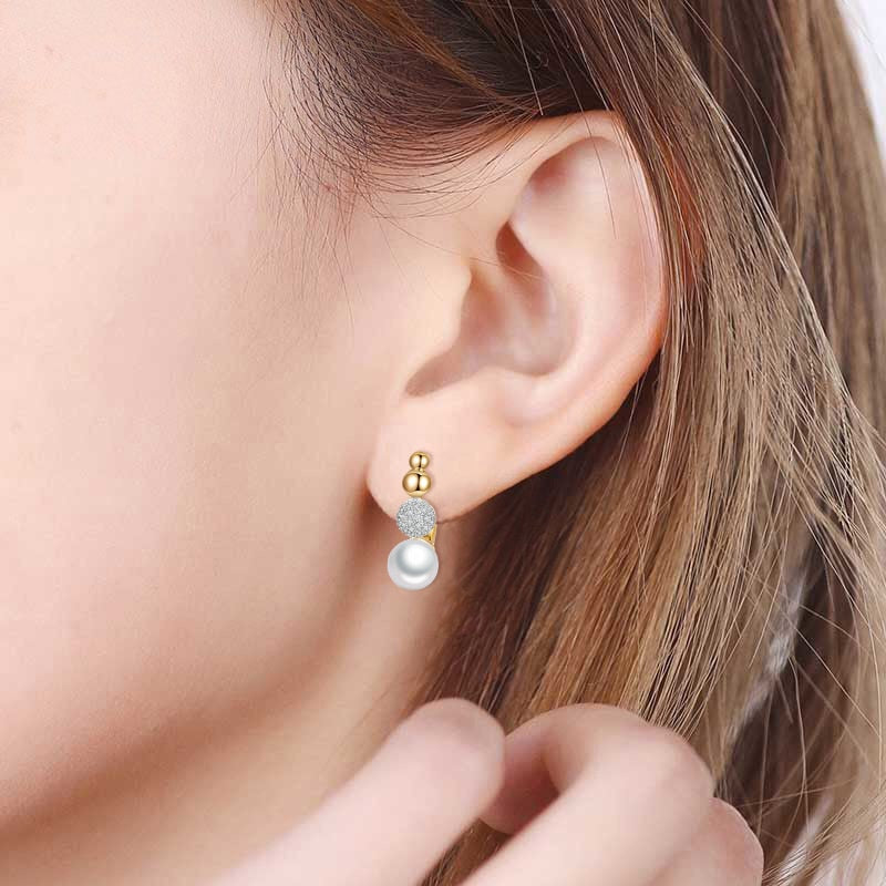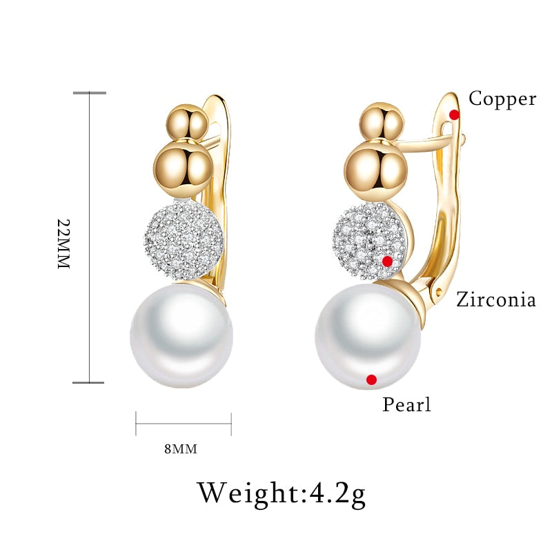Aretes colgantes con perla y bola de cobre con circonita cúbica