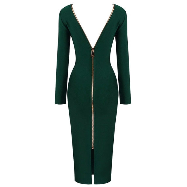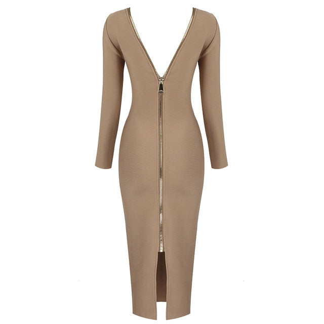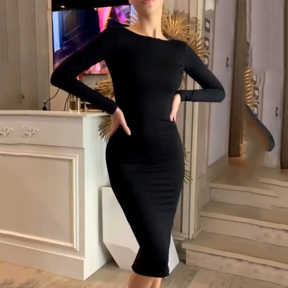 Vestido midi de spandex liso de manga larga con cuello en O y cierre de cremallera