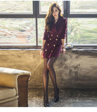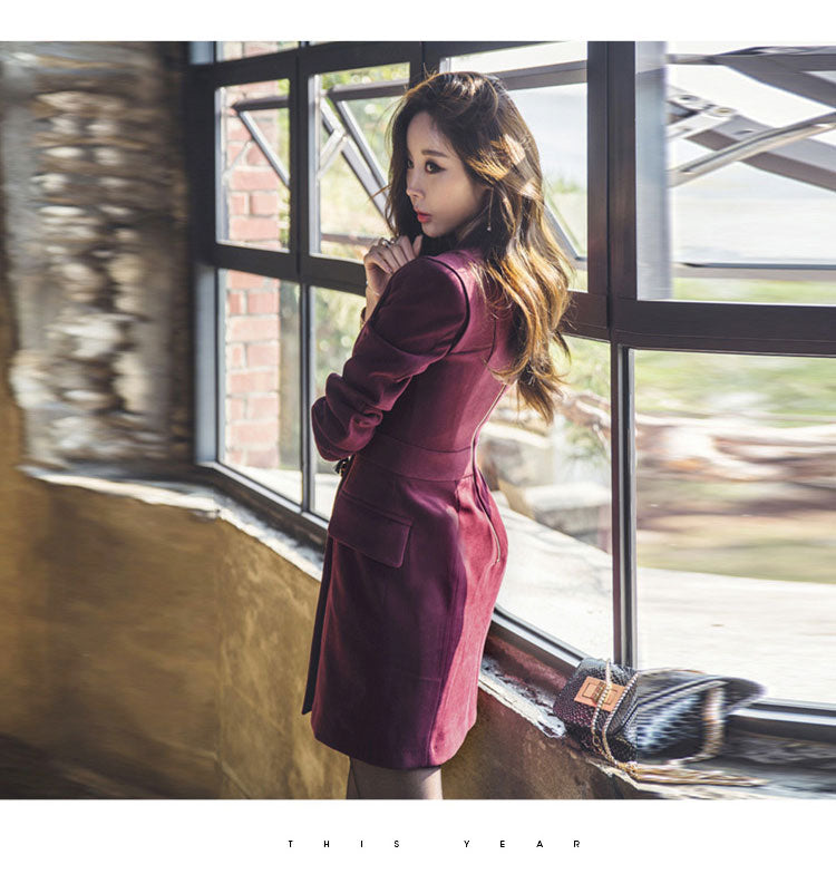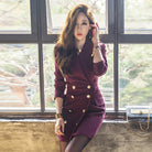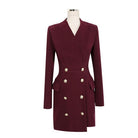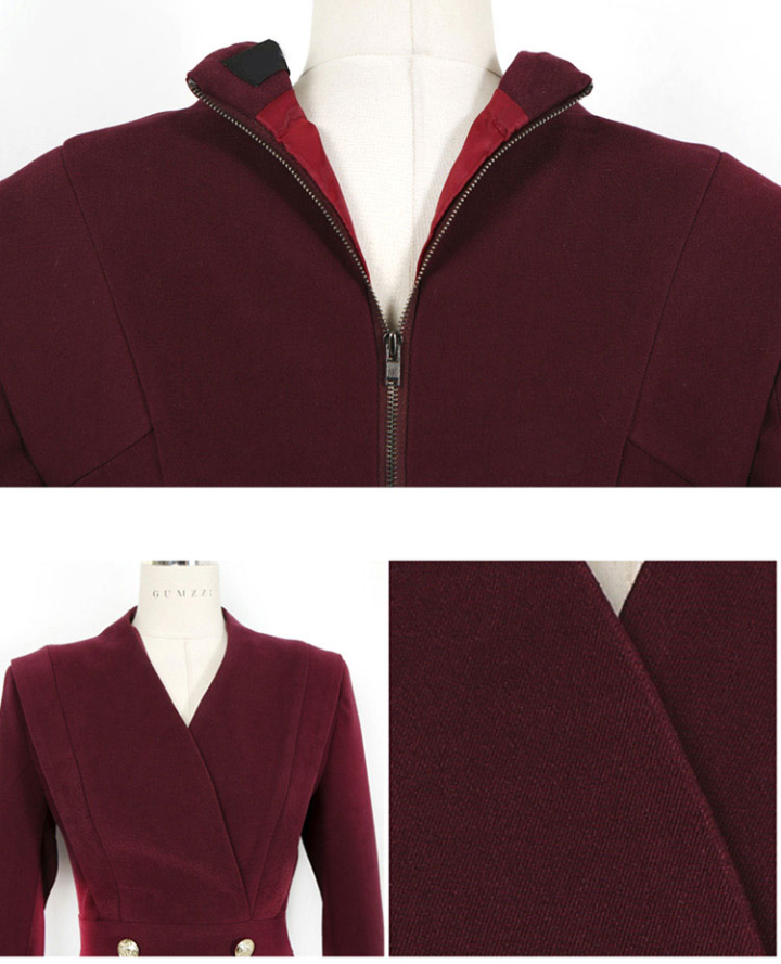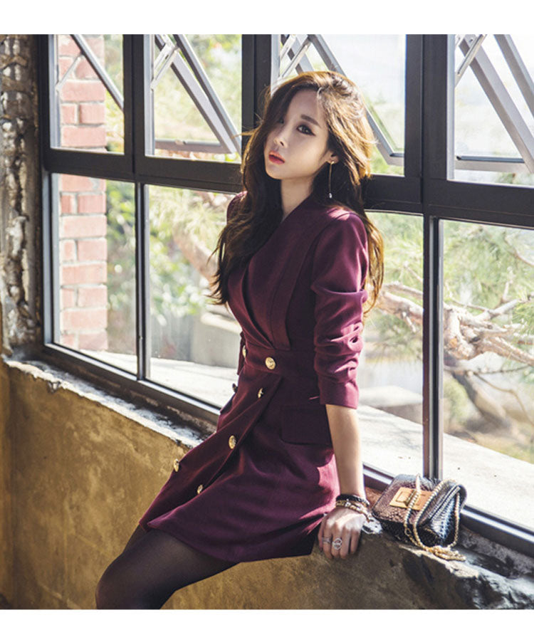 This mini dress has a formal look that you can wear for work. Featuring double-breasted and long sleeves, this dress is perfect to wear during cold weather. It has a zipper closure at the back while the v-neckline and reddish color give it classic look.