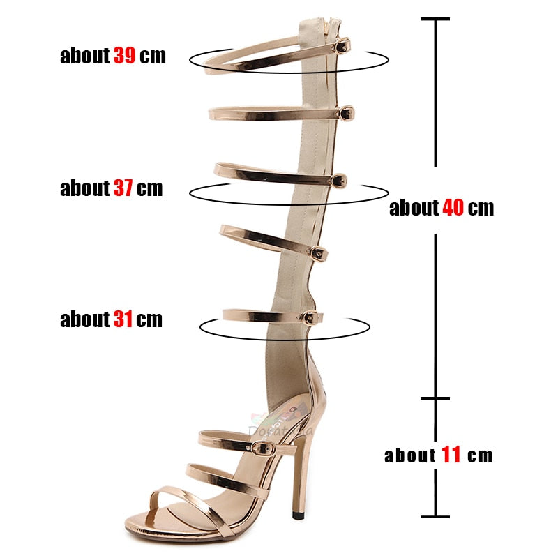 Sandalias de tacón alto de gladiador dorado de lujo para mujer Zapatos abiertos hasta la rodilla