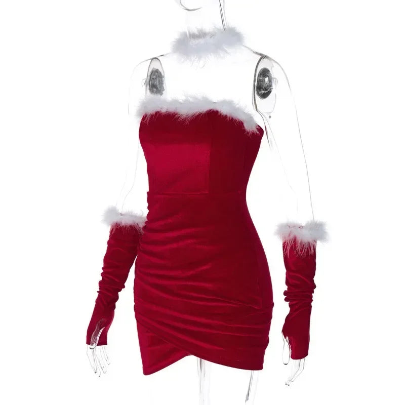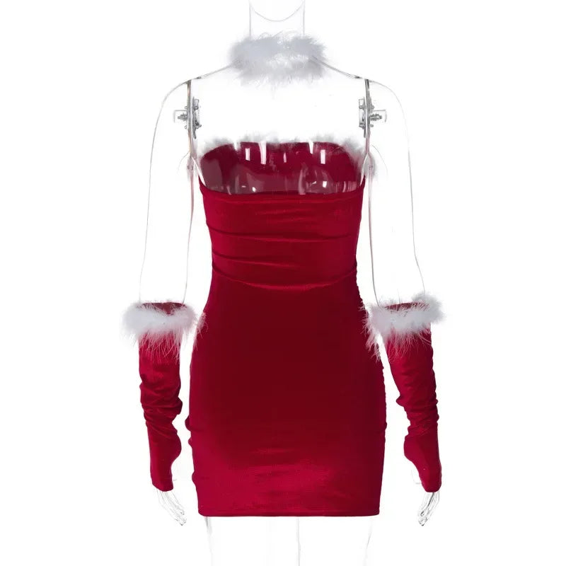 Get ready to turn heads this holiday season with our Merry Snowfall Mini Dress! The strapless neckline and above-the-knee length accentuate your curves, while the playful feathers add a touch of whimsy. Create a stunning, unforgettable look with our Merry Snowfall Mini Dress!