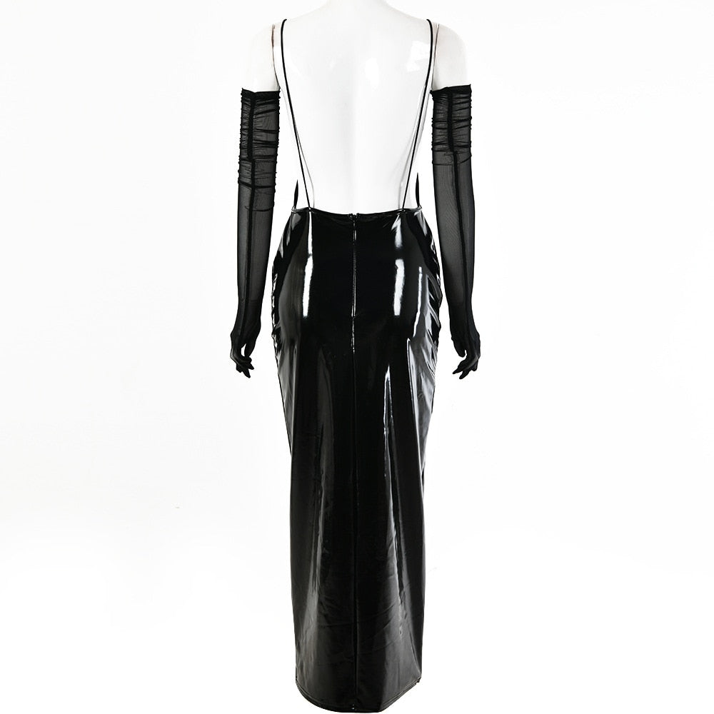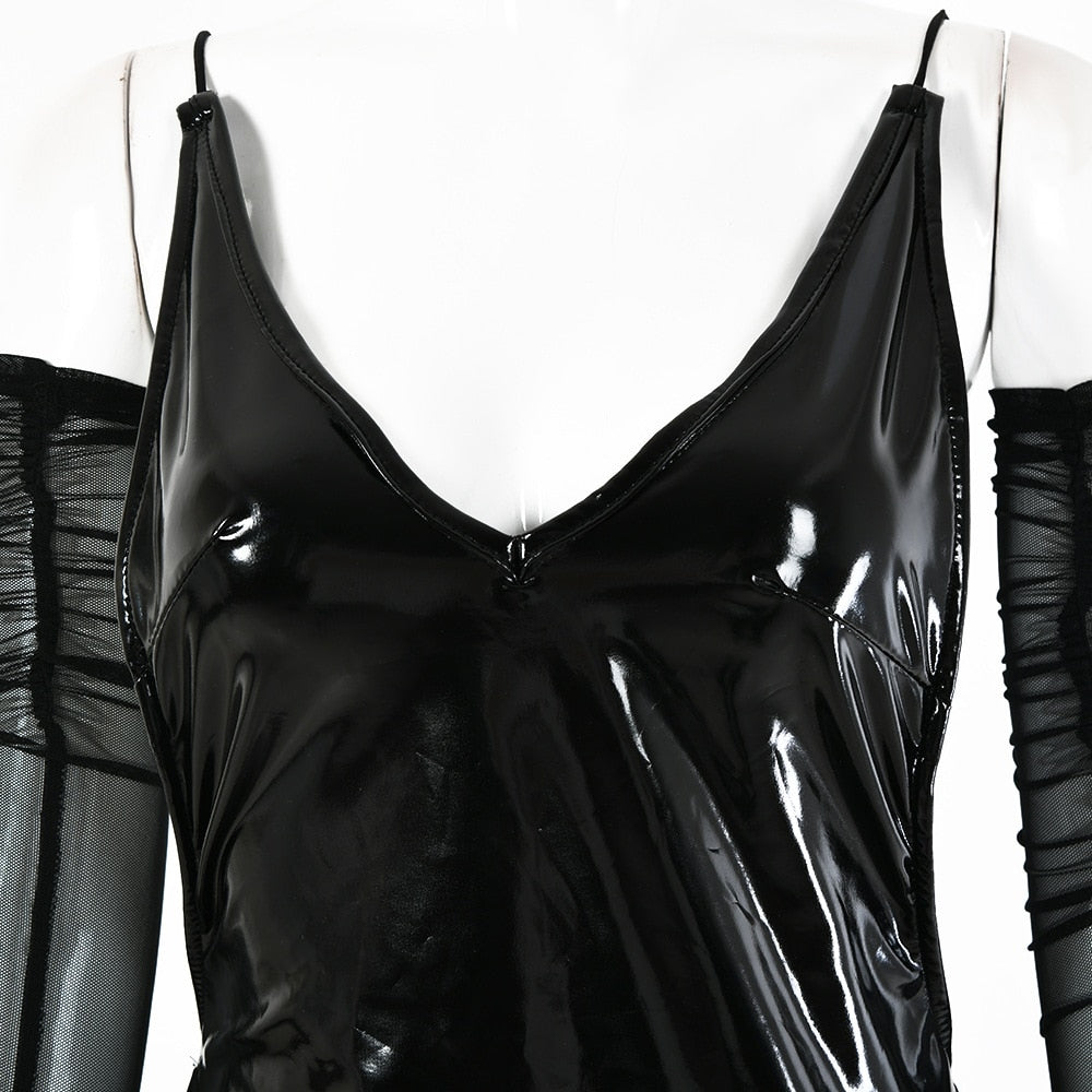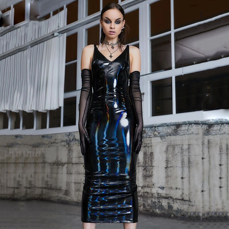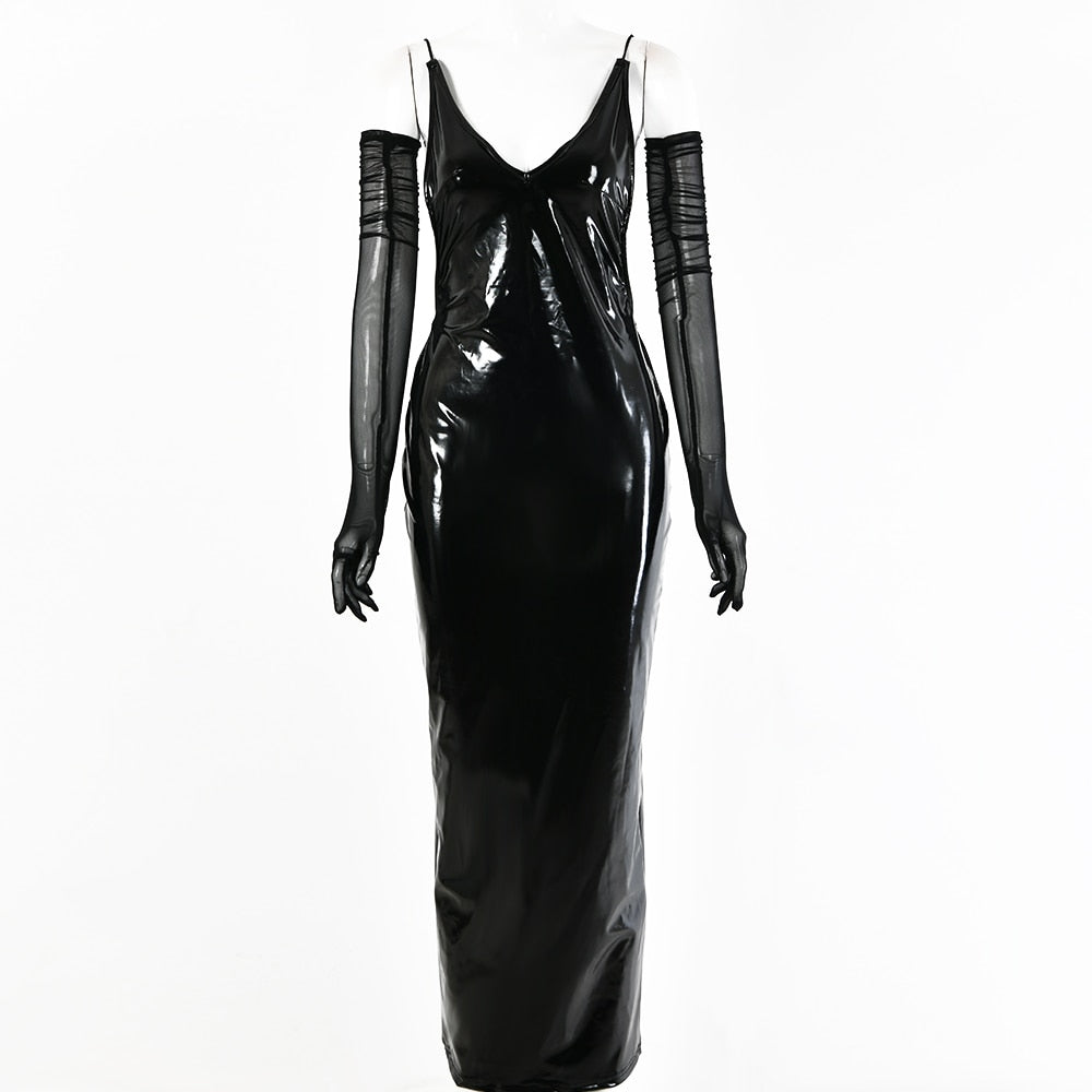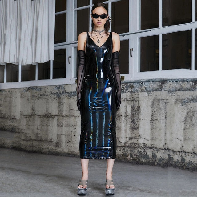 Vestido de media pantorrilla de piel sintética con tirantes finos, escote de pico y color liso
