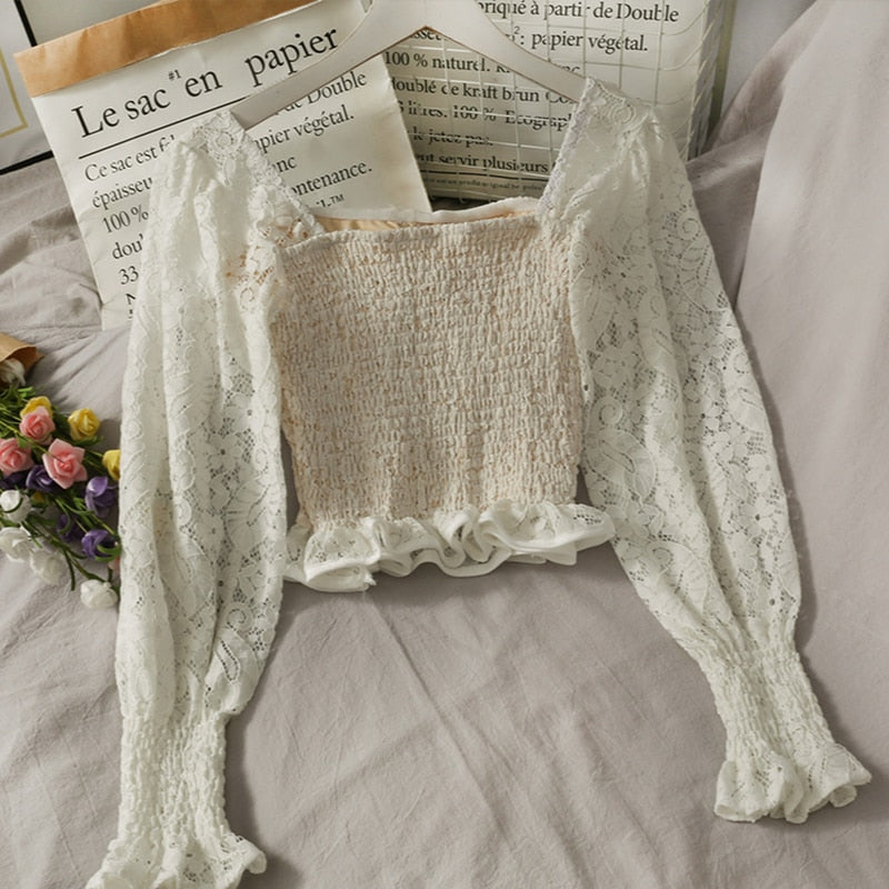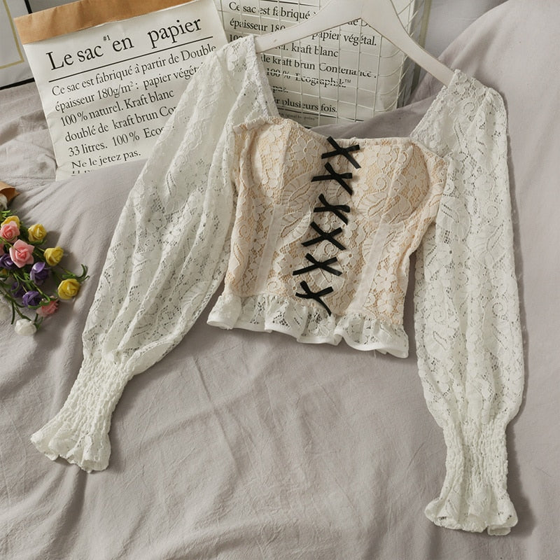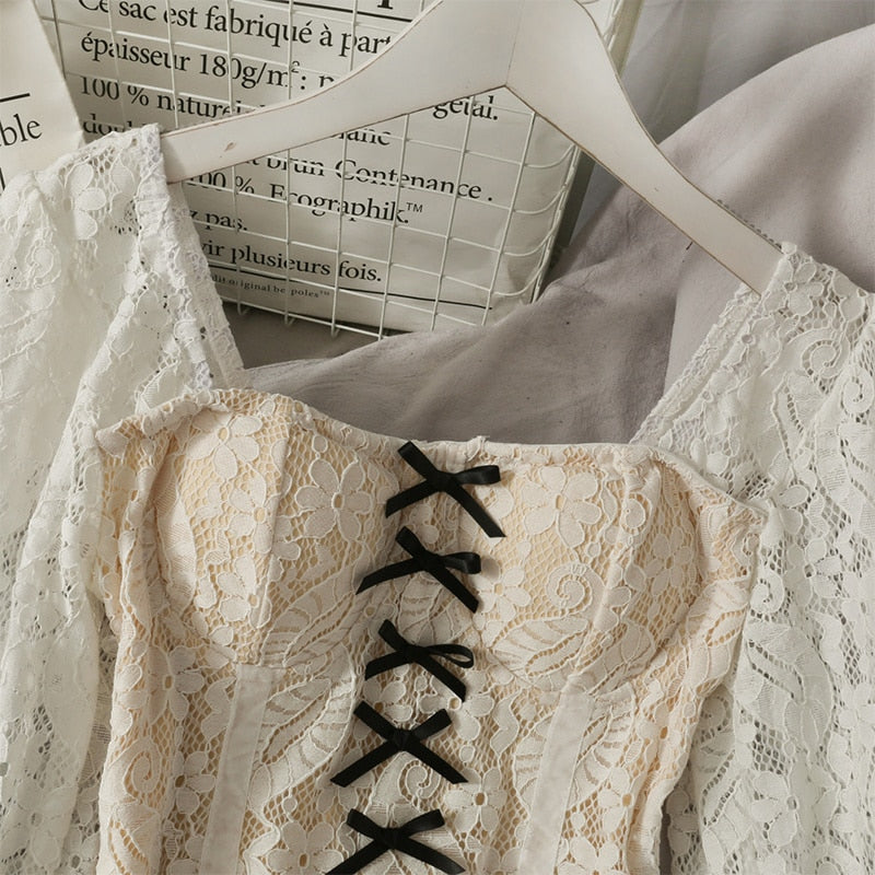 Blusa larga de manga farol con cuello cuadrado y decoración con cordones en la parte delantera