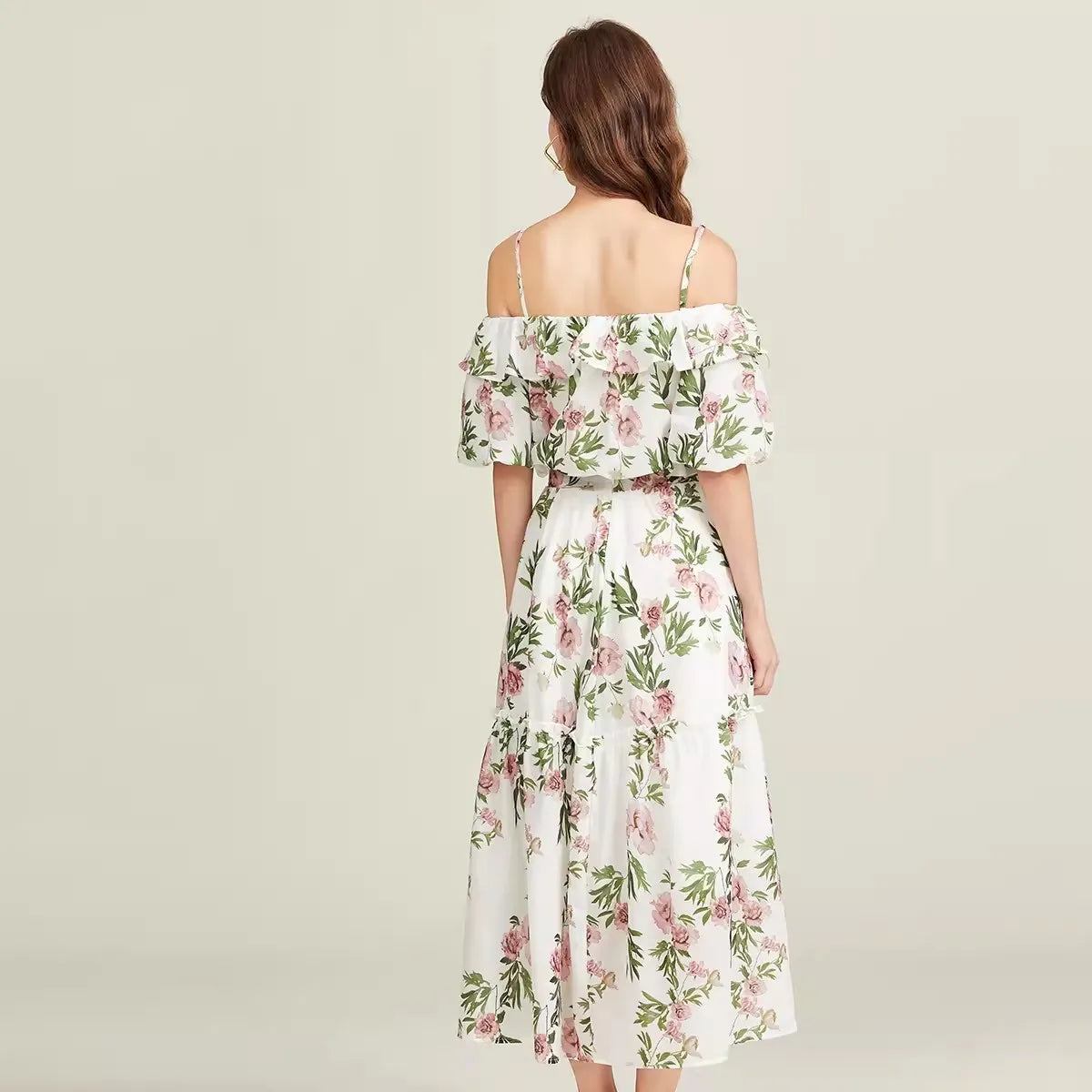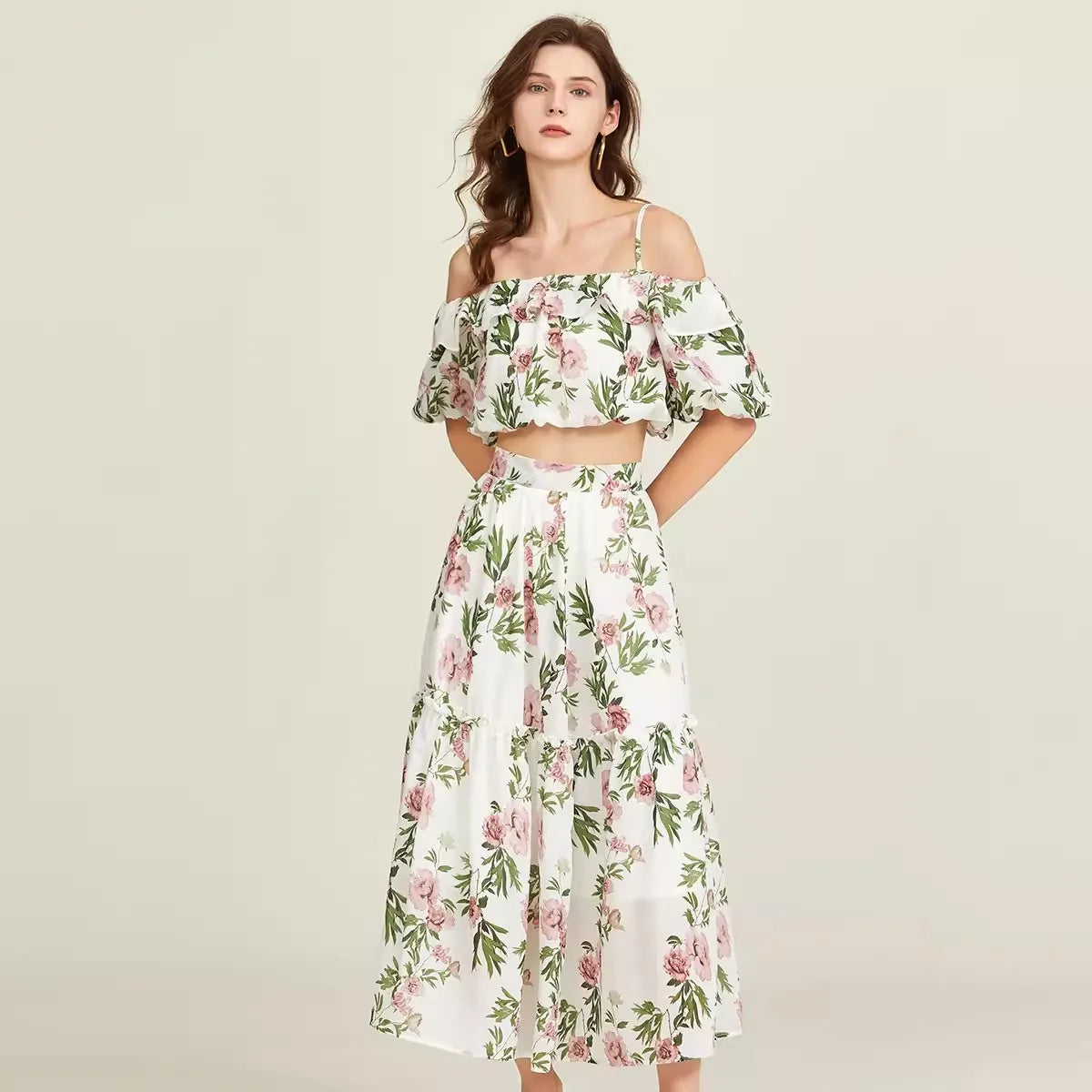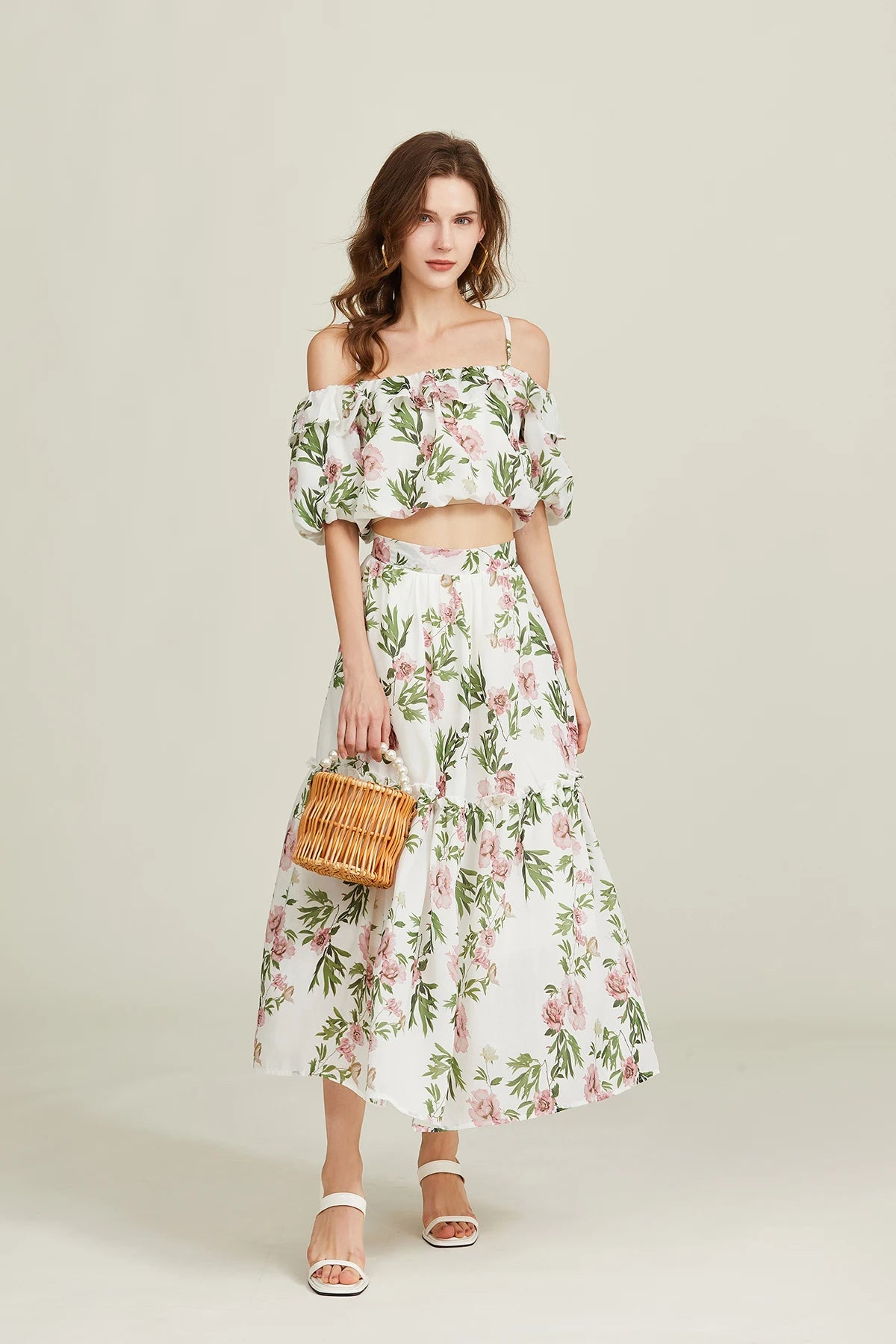 Experience luxuriously soft Spandex and high-quality Polyester with the Moonlight Mist Skirt Set. Featuring a flattering slash neck and a stylish lantern sleeve design, this set is perfect for effortless, comfortable style. The intricate print pattern adds a touch of elegance to any look.