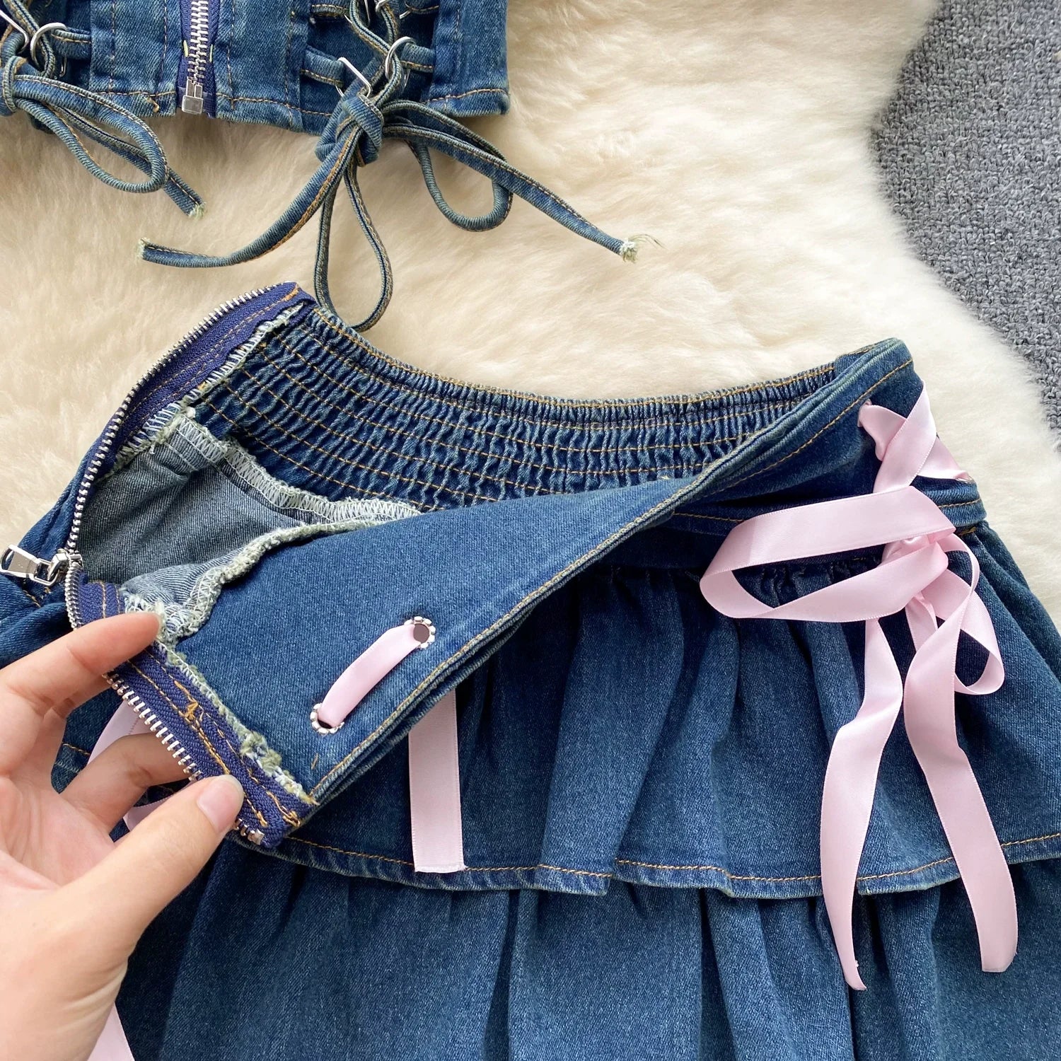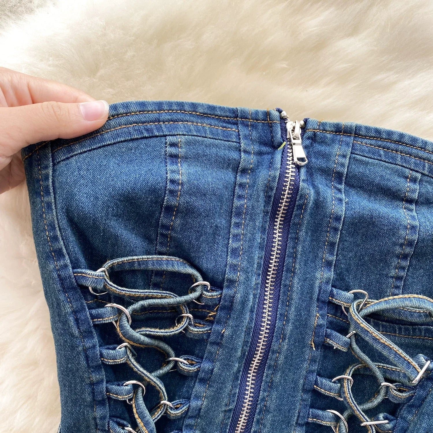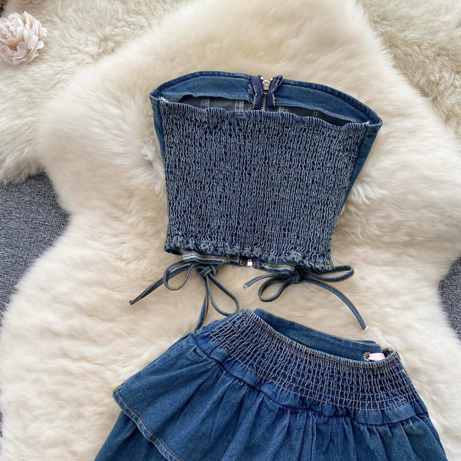This denim skort set effortlessly combines fashion and function. Made with a blend of acrylic, spandex, denim, and polyester, its strapless design and solid pattern provide a unique, stylish look. Perfect for any occasion, this set is a must-have for any fashion-forward individual.