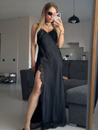 Ignite every room with the Naughty Sparks Maxi Dress, where audacious style meets refined elegance. Constructed from a premium polyester and spandex blend, this floor-length stunner hugs your curves while allowing freedom of movement. The plunging V-neckline exudes confidence and allure, creating an unforgettable focal point. Designed for those who thrive on making bold impressions and aren't afraid to spark conversation wherever they go.