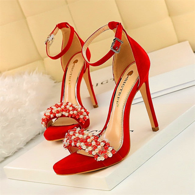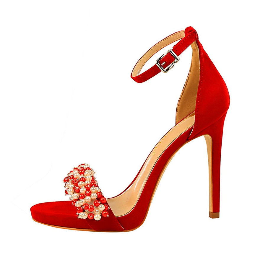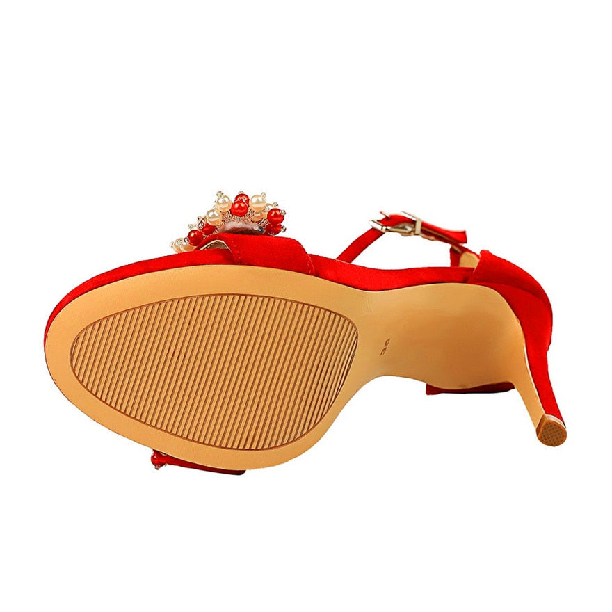 Sandalias de tacón con tiras al tobillo y punta redonda con decoración de perlas de imitación