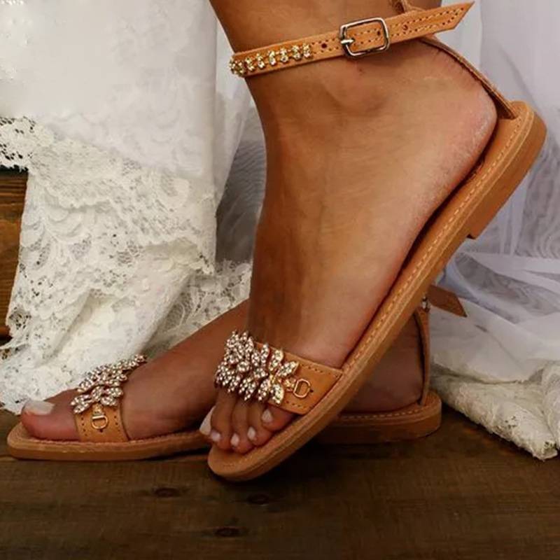 <transcy>Sandalia plana decorada con flores de diamantes de imitación</transcy>