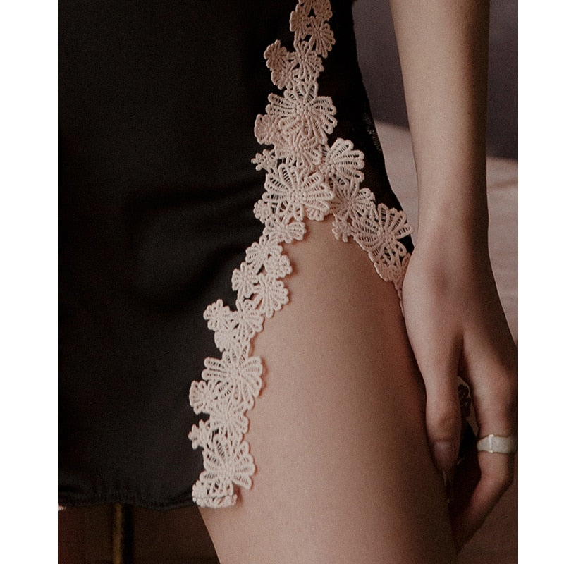 Half See Through Lace Decorated Nightdress with Spaghetti Strap and Floral Applique Decoration