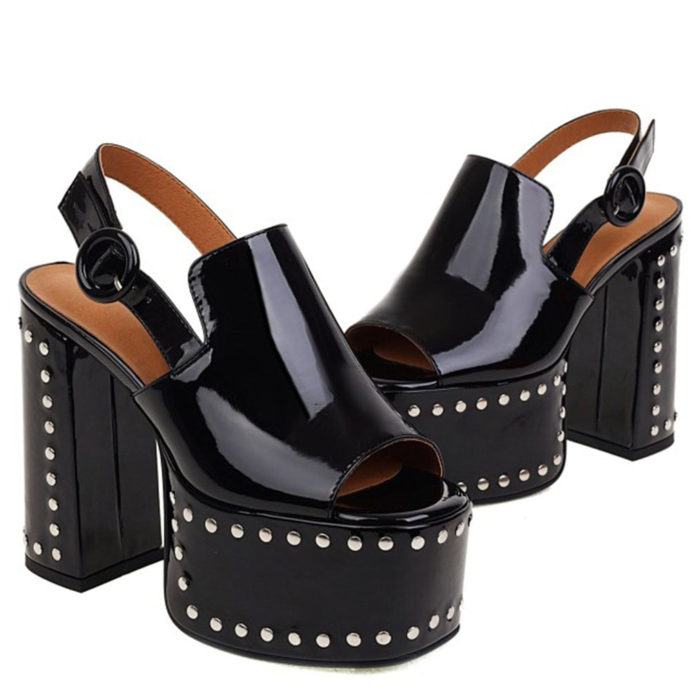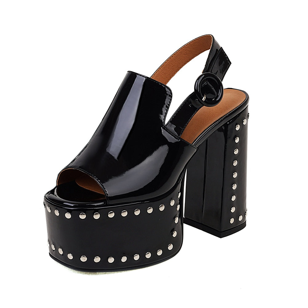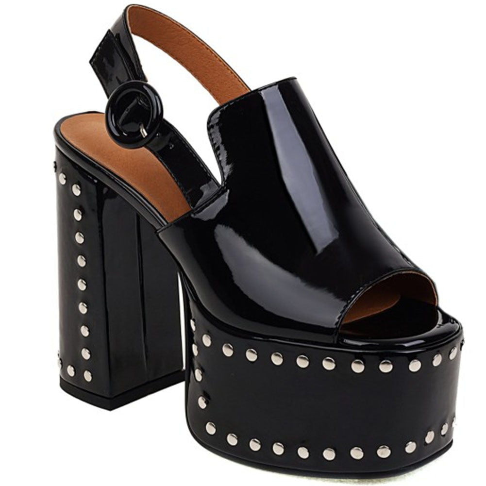These rivet platformed sandals are the perfect way to complete your look. The thick sole and chunky heel will provide stability and support, while the open toe and slingback ankle strap will give you a more comfortable and easy fit. The wide upper strap will keep the sandal in place. The sleek black, red and white color is versatile and goes with just about anything, so you'll be able to wear these sandals with any outfit.