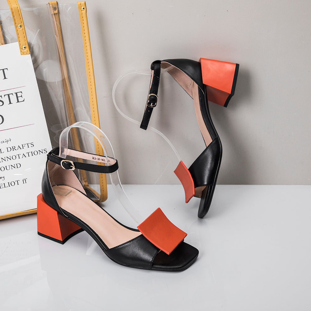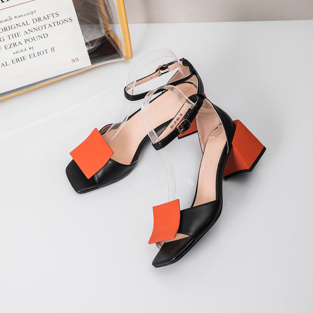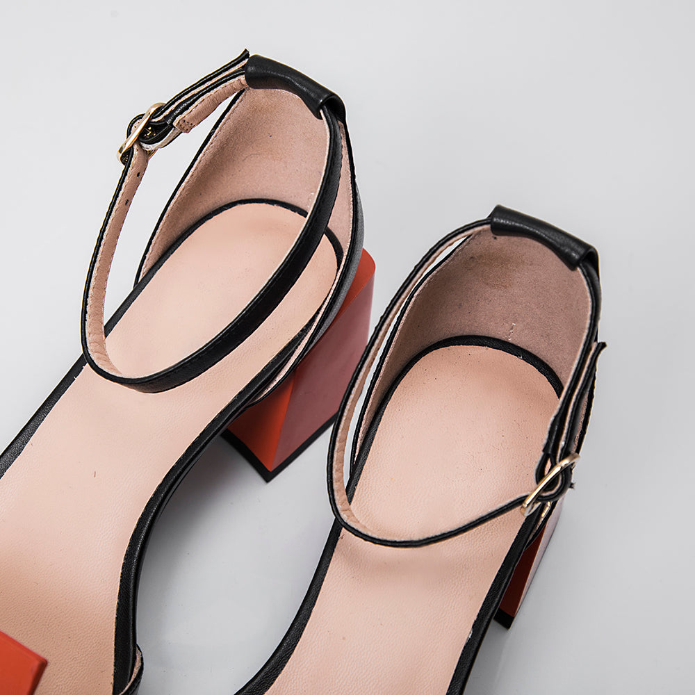 Sandalias de piel de oveja genuina sólida con tacones gruesos, decoración de apliques de forma cuadrada y cierre de correa en el tobillo