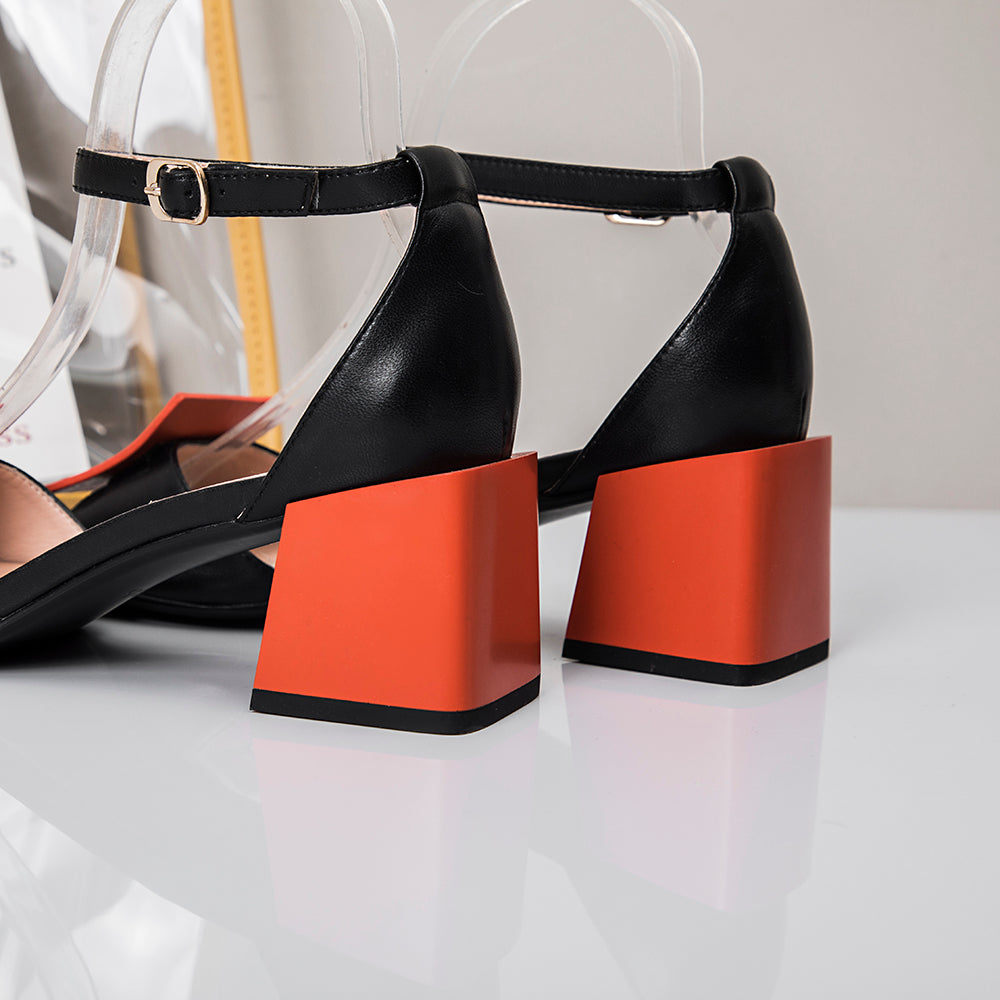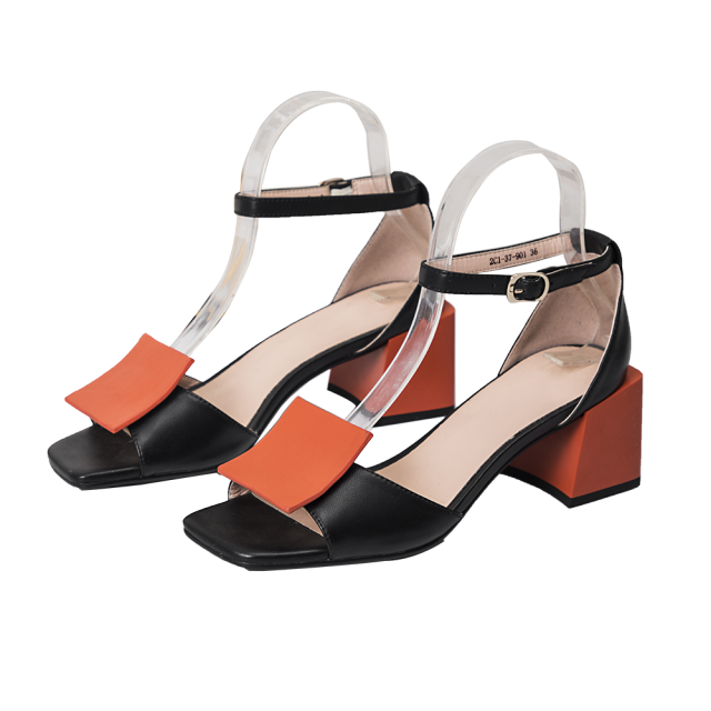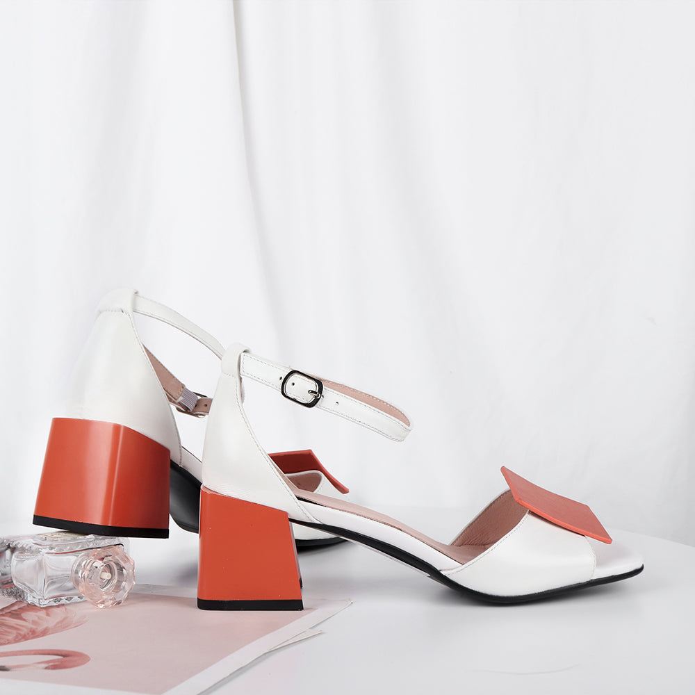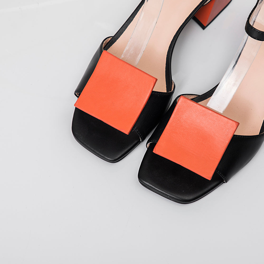 Sandalias de piel de oveja genuina sólida con tacones gruesos, decoración de apliques de forma cuadrada y cierre de correa en el tobillo