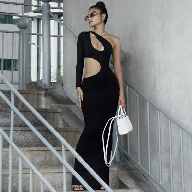Get ready to turn heads in our Rattle My Brain Maxi Dress! With its slim fit silhouette and asymmetrical neckline, this dress is designed to flatter your natural waistline. The hollow out decoration adds a touch of edgy elegance, this dress is a must-have for any fashion-forward wardrobe!