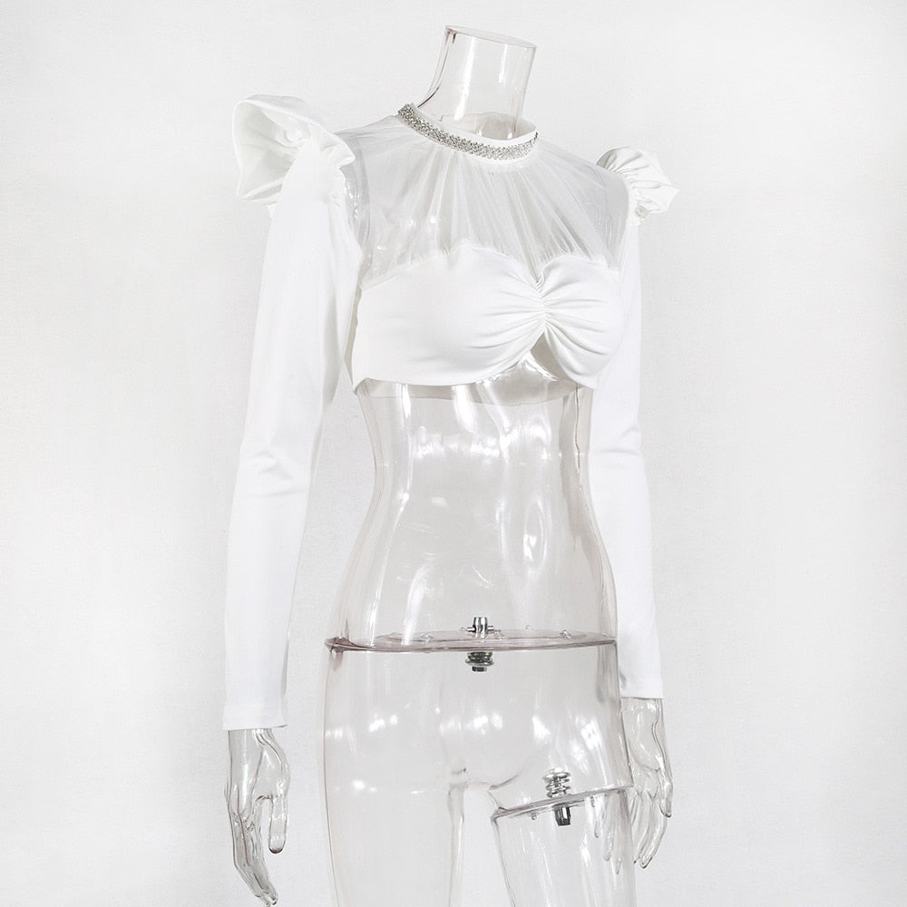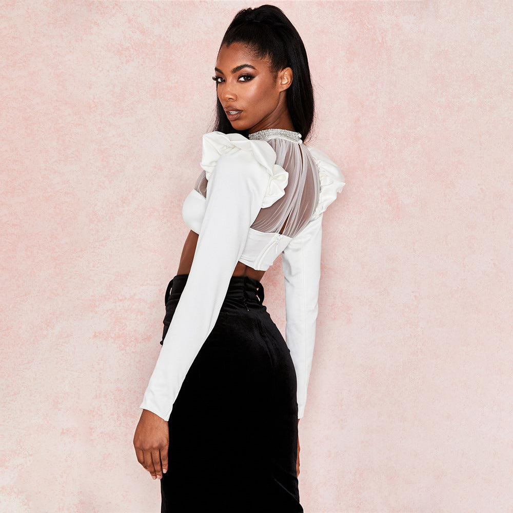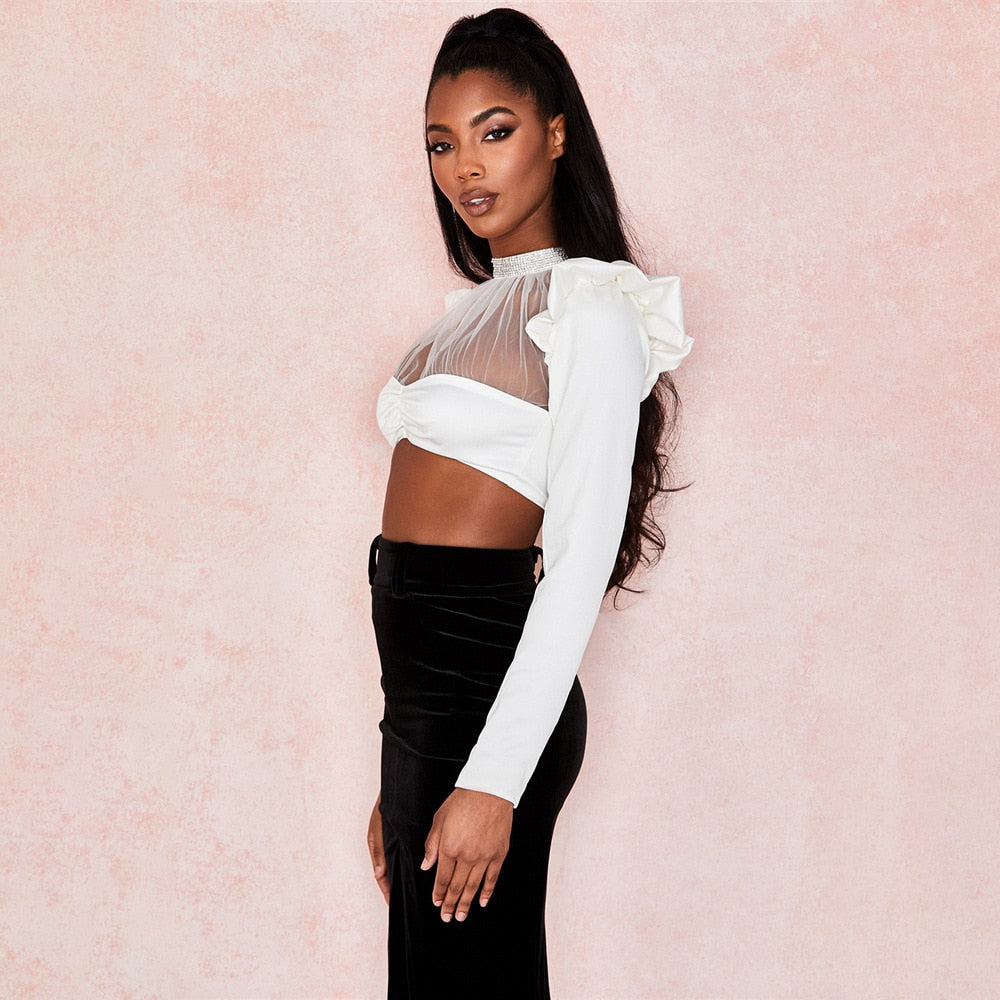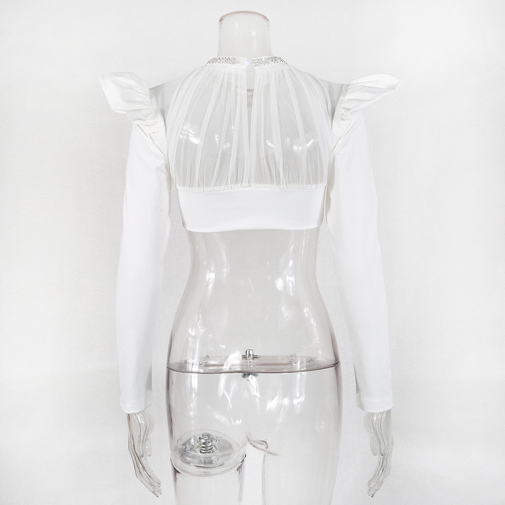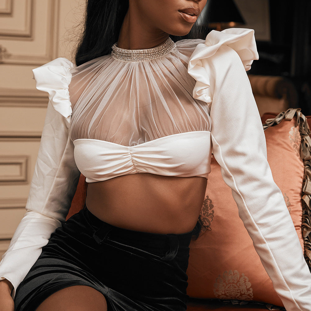 <transcy>Top corto de mujer con manga con volantes y empalme de malla transparente</transcy>