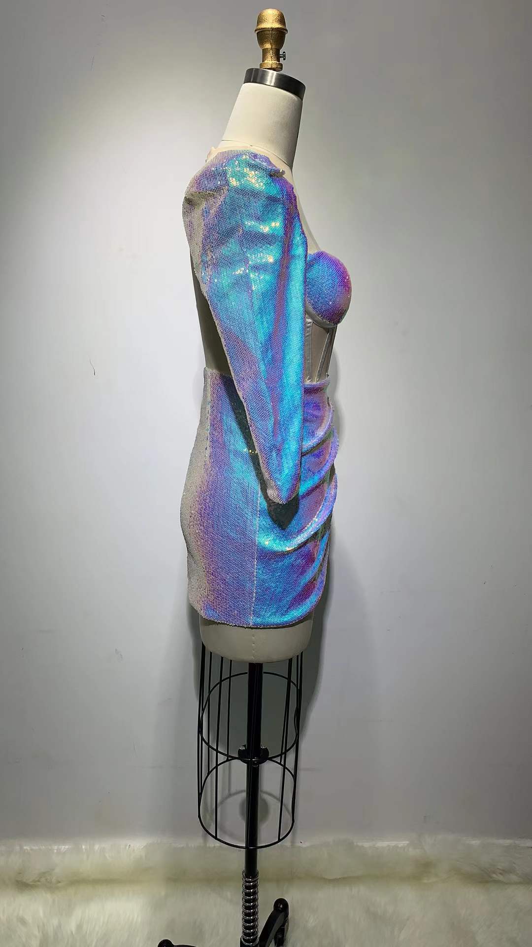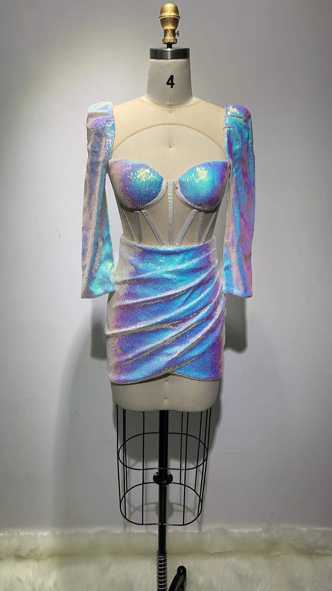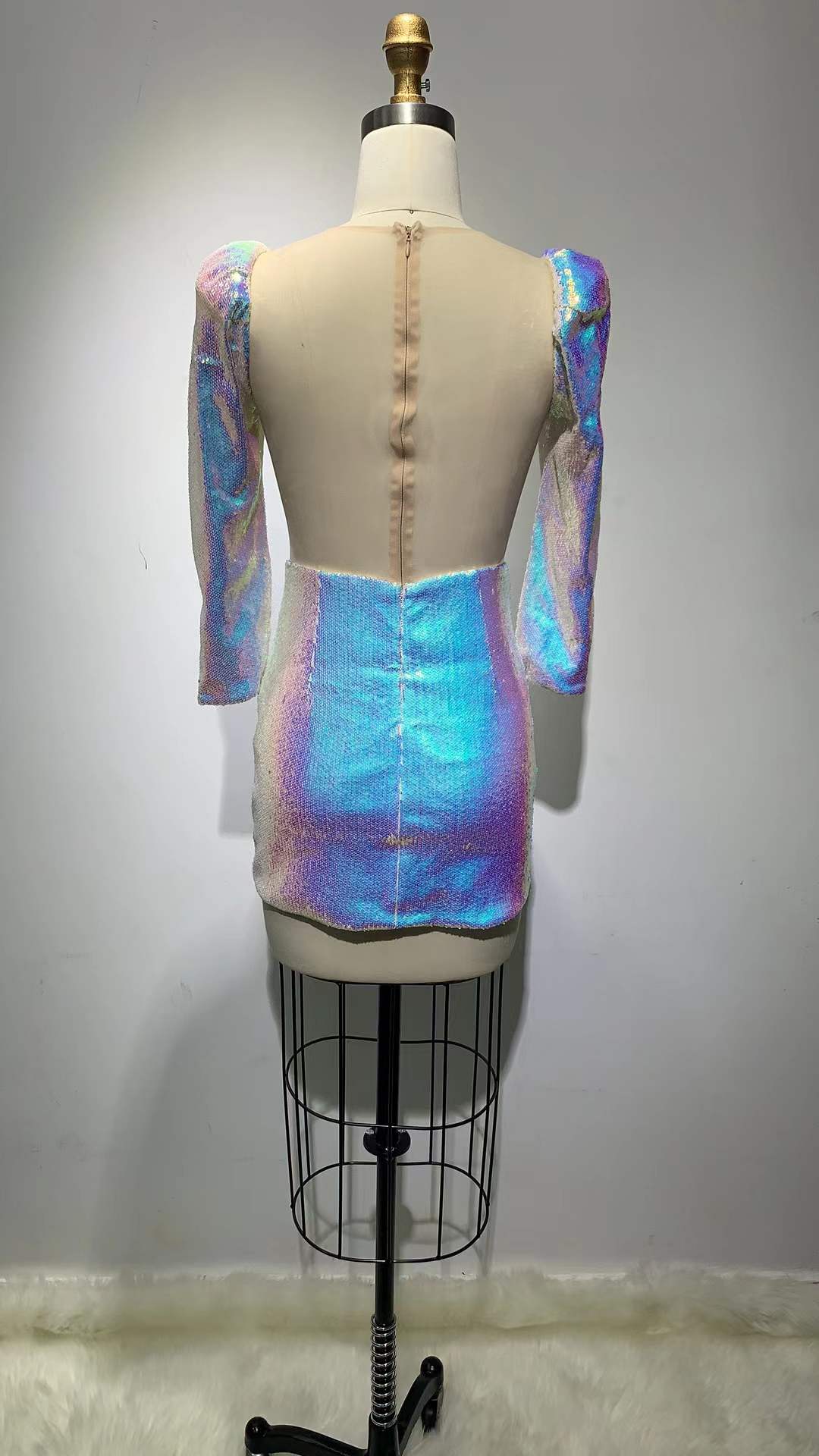 This multi-colored dress is a fun and trendy way to make a statement. The square neckline and puffy sleeves offer a flattering look that is sure to make her look great. You'll look adorable while sporting the bright and bold color combo.
