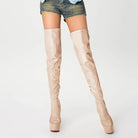 Elevate your stride with these audacious over-the-knee boots that command attention. Crafted from lustrous patent leather, they deliver an unmistakable shine that catches every eye. The platform sole adds both attitude and comfort, while the thigh-high silhouette makes a bold fashion statement. Perfect for those ready to turn heads and own the room with confidence and edge.