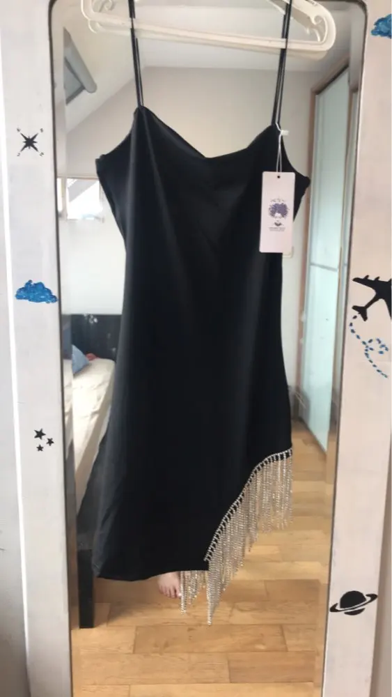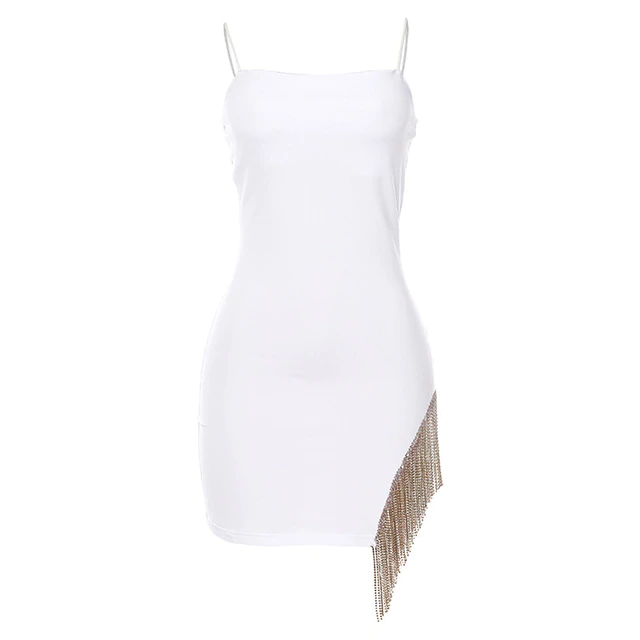 <transcy>Mini vestido de mujer con tirantes finos y borlas laterales</transcy>