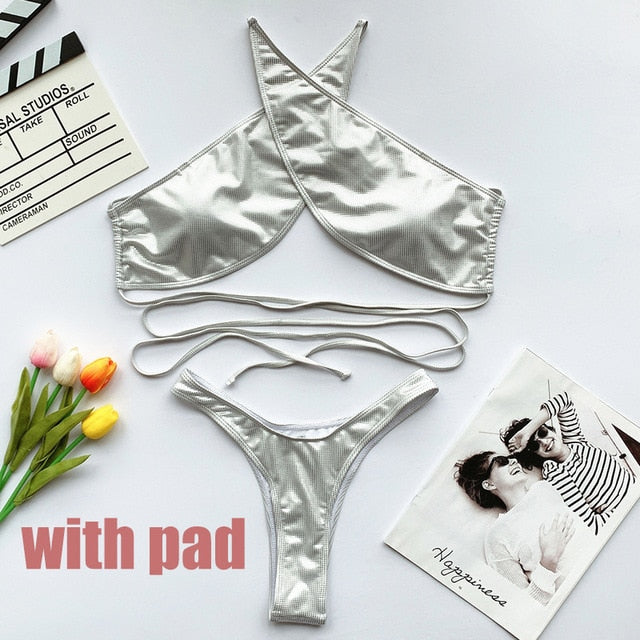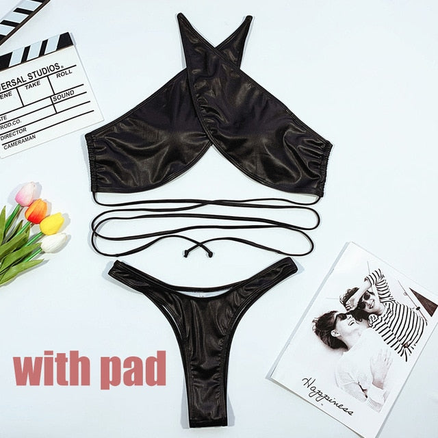 Bikini de spandex de poliéster con estampado de animales con estilo de top halter cruzado