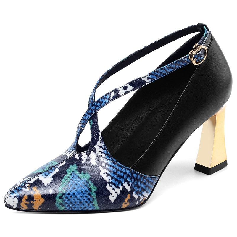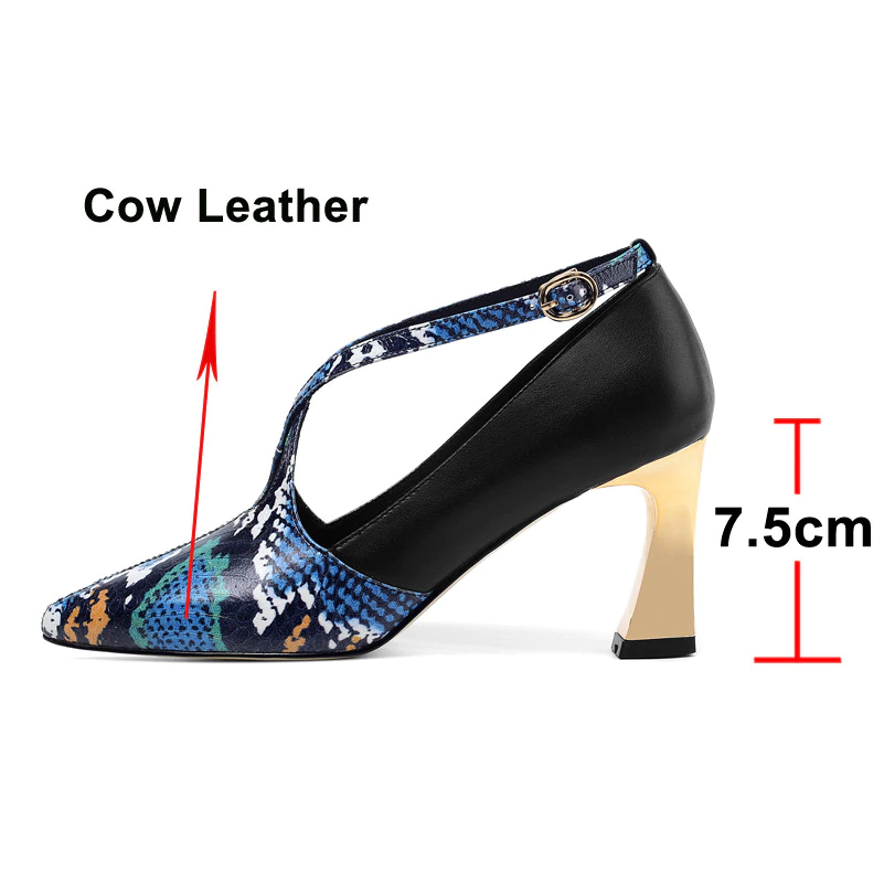Tacón extraño de cuero de vaca en punta puntiaguda con hebilla