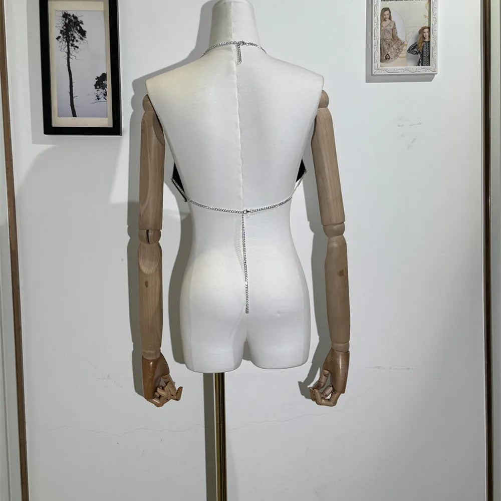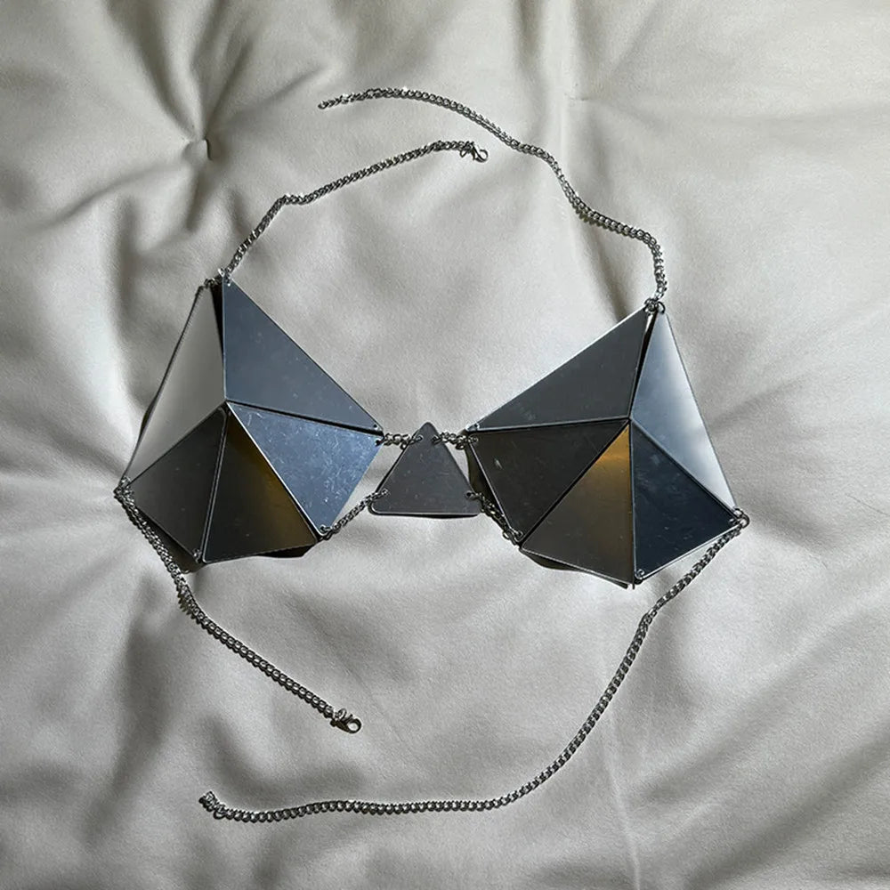 The Spiked Halo Bra Top fuses sleek polyester with bold metal accents to create an unforgettable body jewelry piece. Its striking solid design and edgy spikes demand attention, perfect for those who dare to lead with fierce confidence.