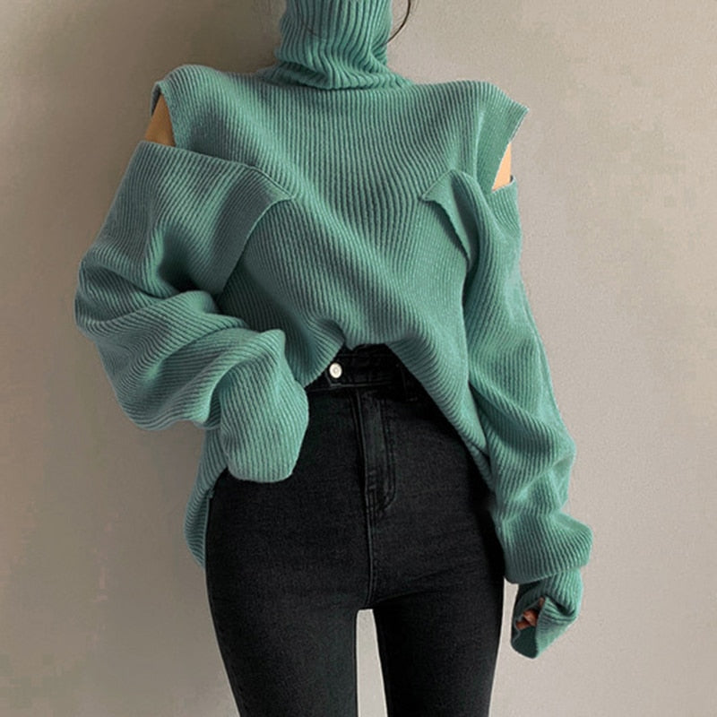Suéter con hombros descubiertos y cuello de tortuga, decoración de botones y material de algodón y poliéster