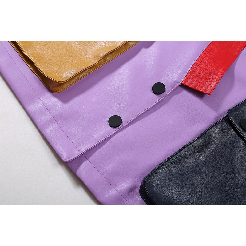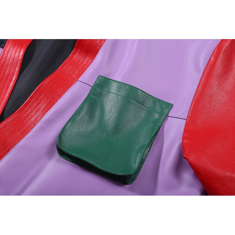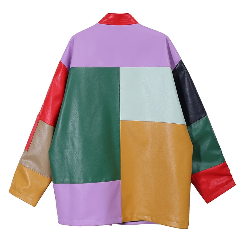 Chaqueta con cierre de botonadura sencilla con patchwork multicolor, decoración de bolsillo, algodón y material de PU