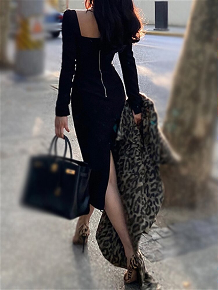 This lovely midi dress is made of cotton and features a square collar and long sleeves. The dress is great for wearing to work or to go out.