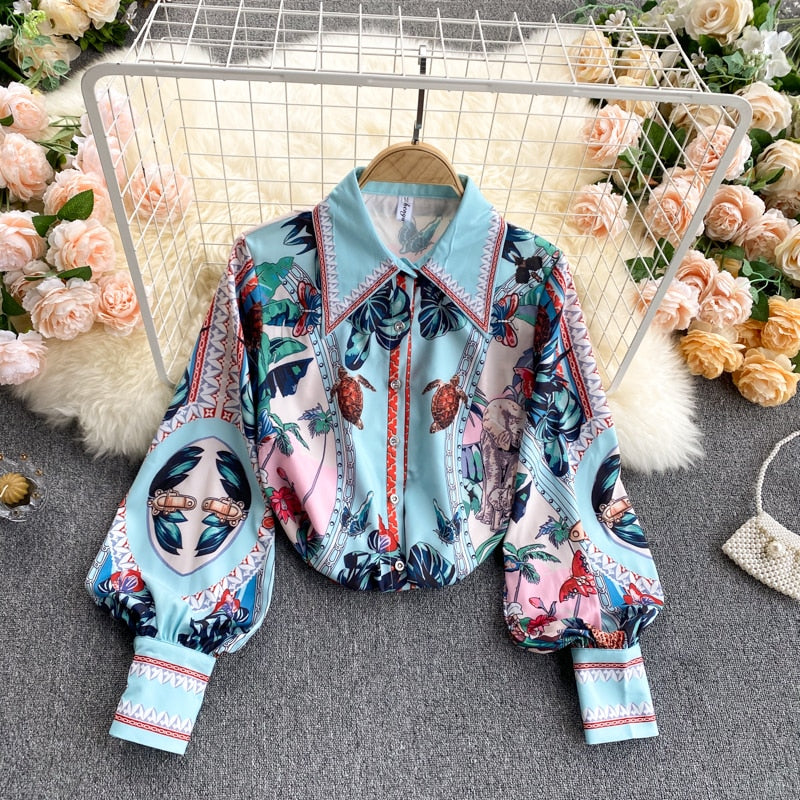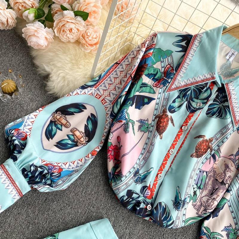 Conjuntos de camisa de manga farol y falda de cintura elástica con estampado tropical