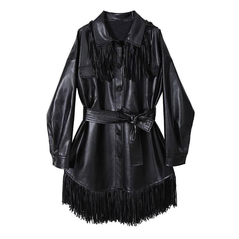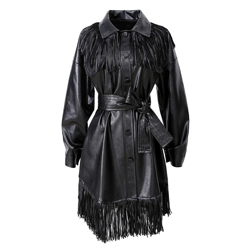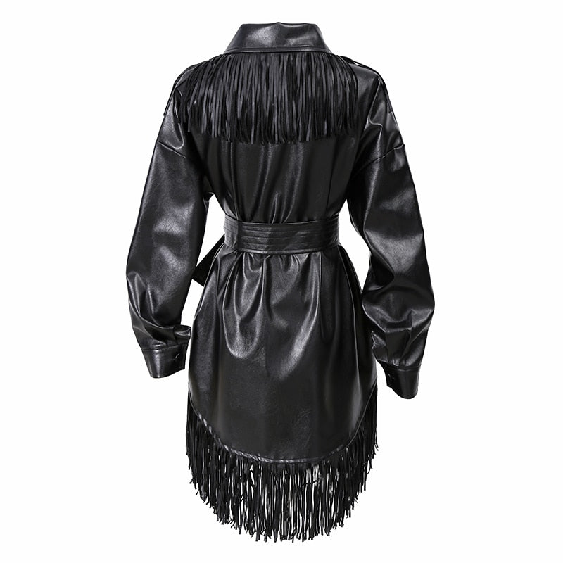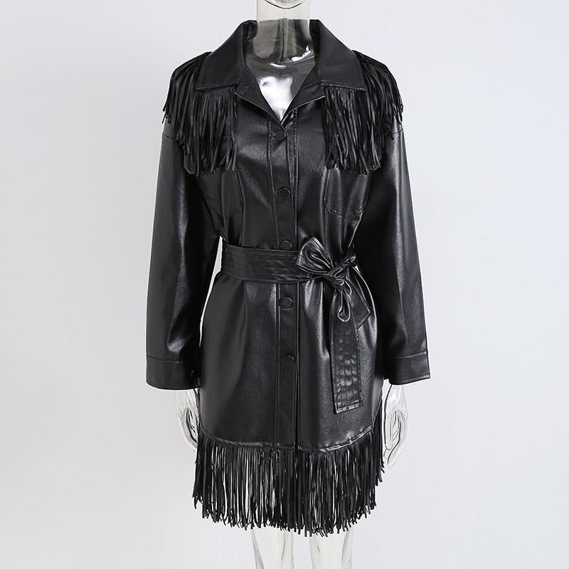 Abrigo de un solo pecho de PU sólido con fajas, borlas y decoración de bolsillo