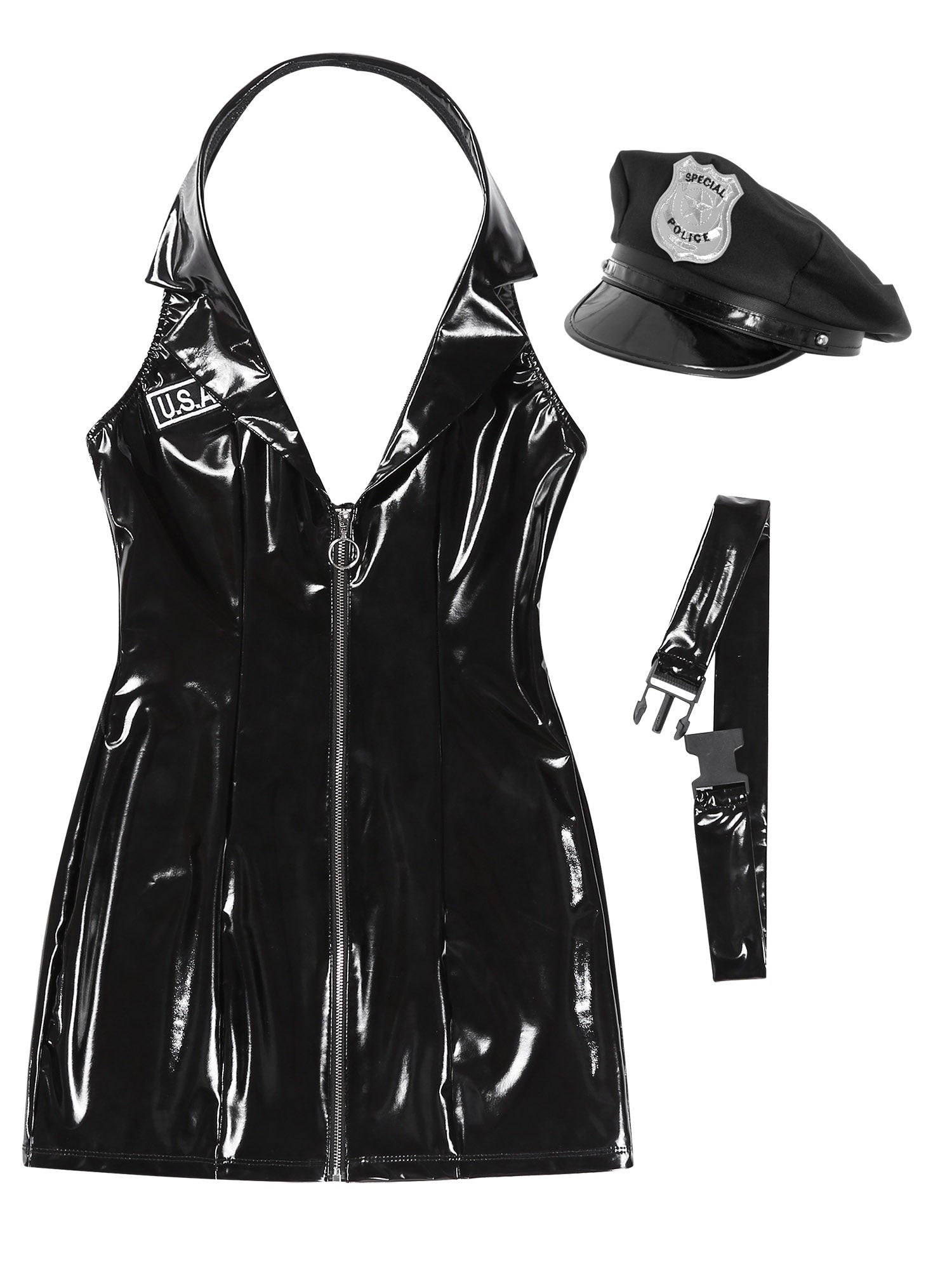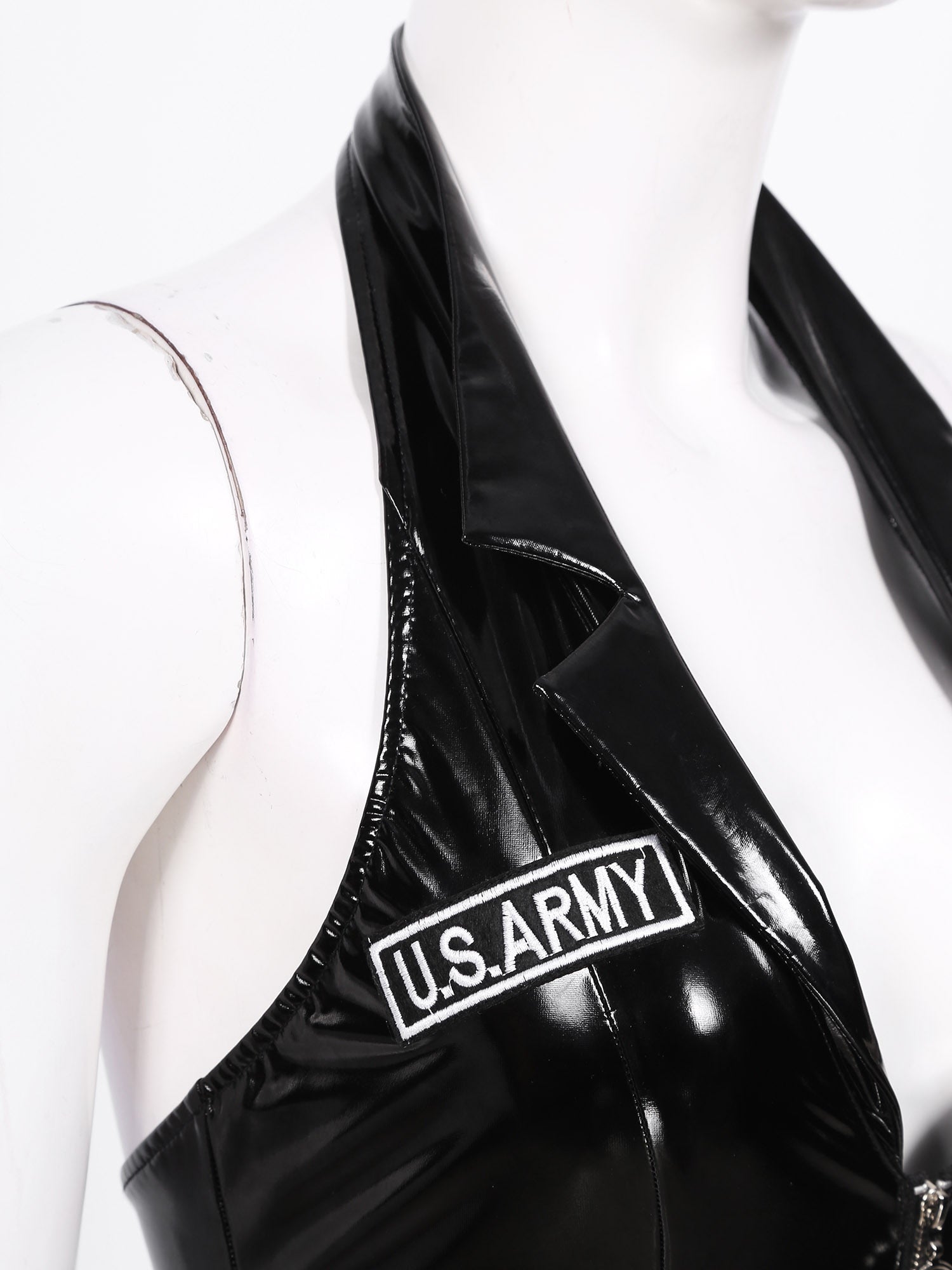 The sleeves of this dress have a dramatic flared shape that reveals the skin and sexiest of shoulders. The halter neckline is a sexy and elegant choice that makes this mini dress the perfect addition to any outfit. The leather material adds the finishing touch to this stylish outfit. This versatile mini dress is the perfect way to dress up or dress down in countless ways.